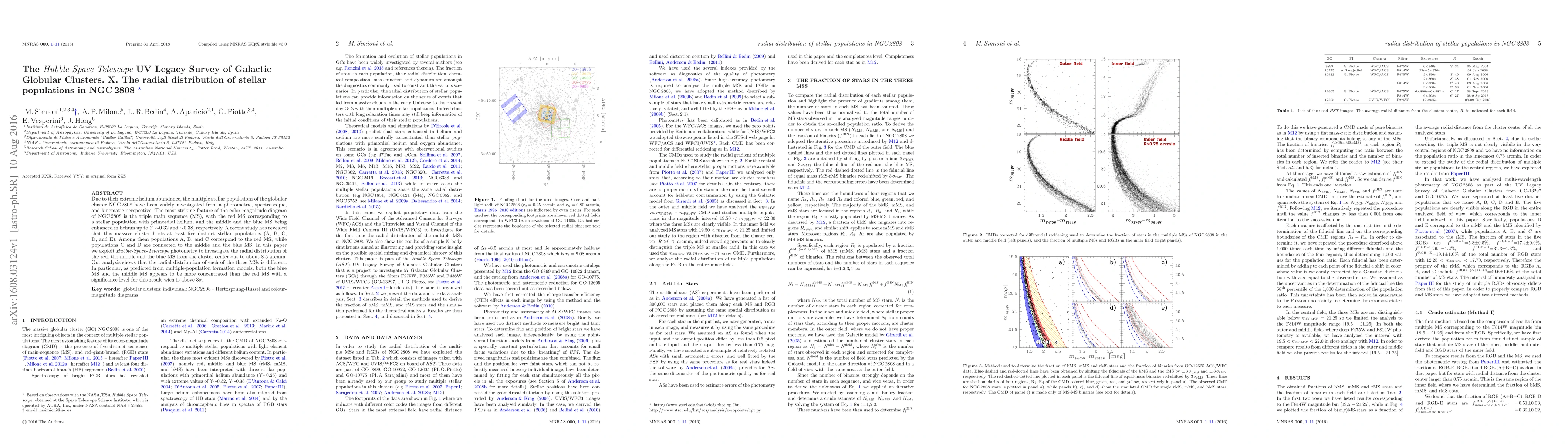 This paper uses Hubble Space Telescope data to analyze the radial distribution of stellar populations in NGC 2808, revealing distinct concentration levels for its red, middle, and blue main sequences. The blue and middle main sequences are more concentrated than the red one, consistent with multiple-population formation models.