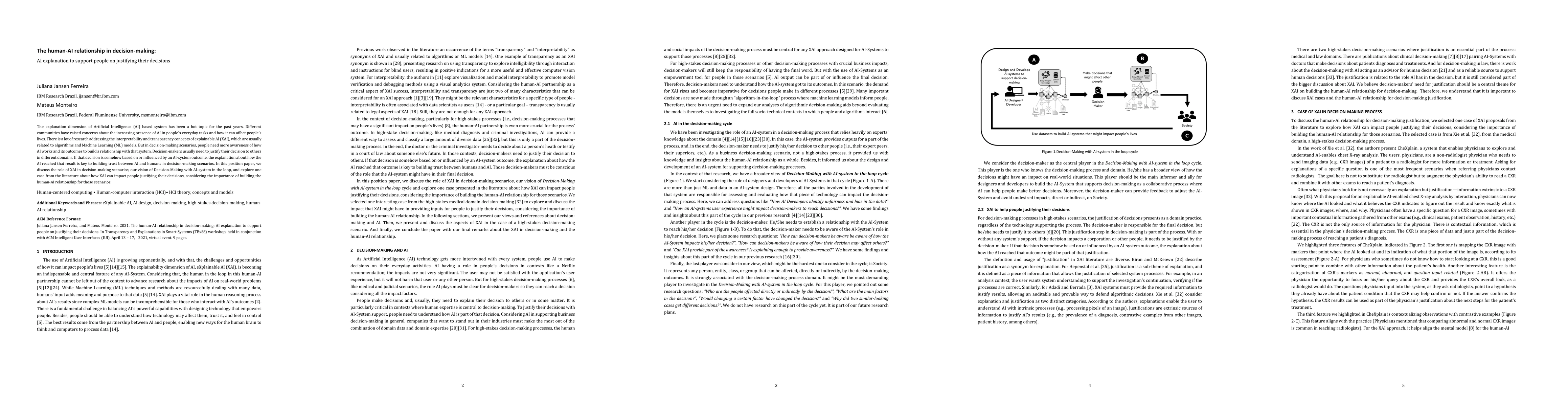 This paper explores the role of explainable AI (XAI) in decision-making, emphasizing the need for AI explanations to help people justify decisions influenced by AI systems. It highlights the importance of building trust through transparency and interpretability in human-AI interactions.
