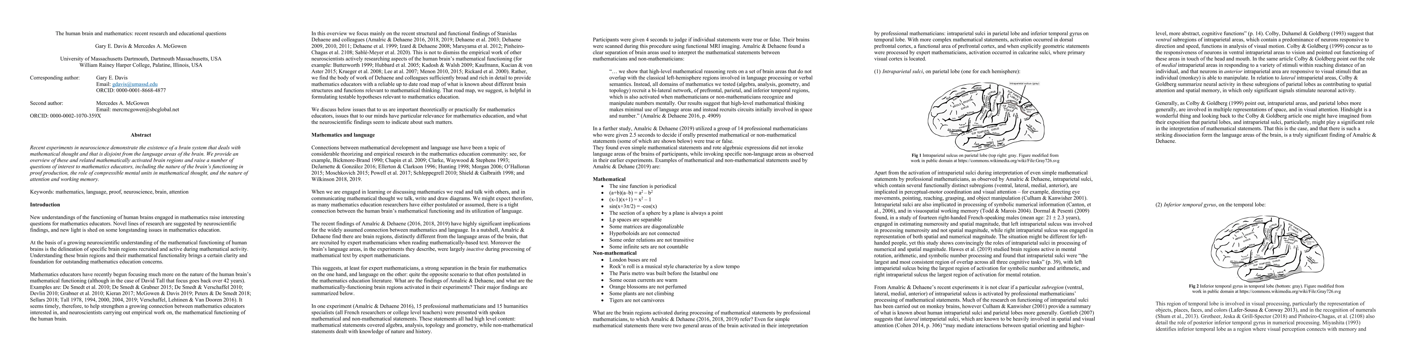 Summary: Recent neuroscientific findings provide new insights into the human brain's engagement with mathematics, prompting significant questions for mathematics educators and suggesting novel research directions while re-evaluating longstanding educational issues.
