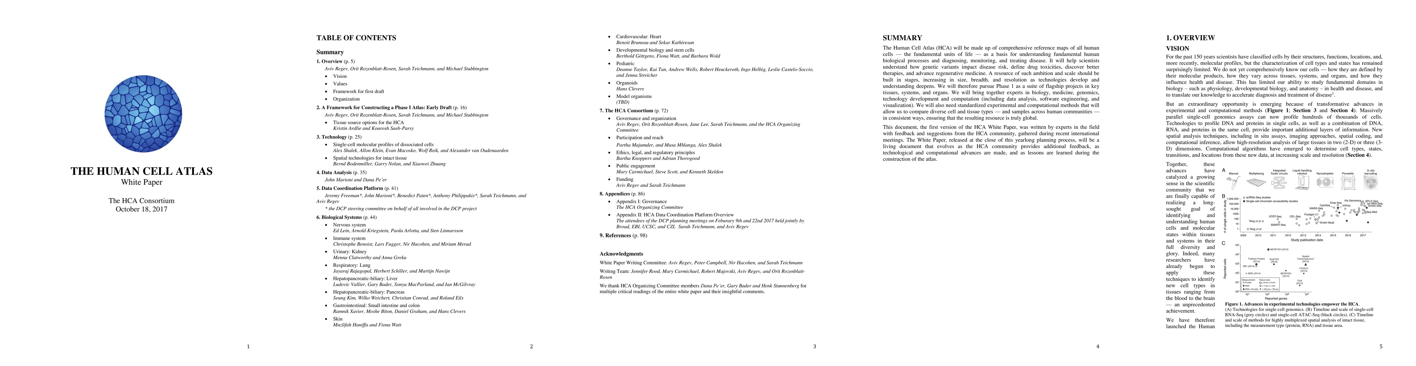 The Human Cell Atlas (HCA) White Paper outlines a comprehensive plan to create reference maps of all human cells, aiming to understand fundamental biological processes and aid in disease diagnosis, monitoring, and treatment. The plan involves constructing the atlas in phases, starting with key tissues, systems, and organs, and integrating biological, medical, genomic, technological, and computational expertise.