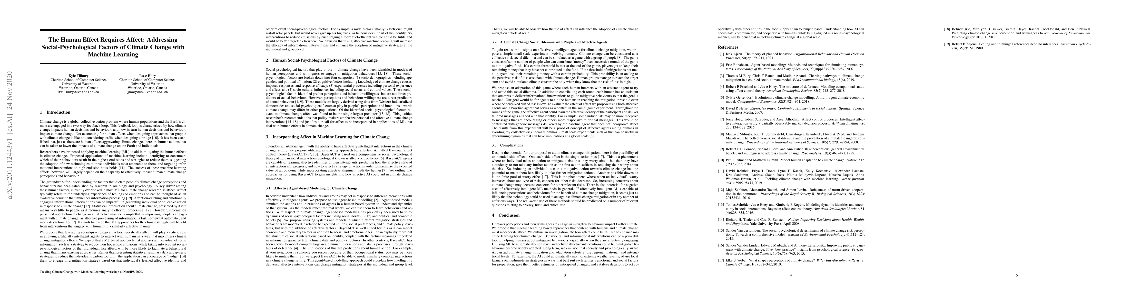 This paper explores how incorporating affect, a key social-psychological factor, into machine learning interventions can enhance efforts to mitigate the human effects of climate change. It proposes affective agent-based modelling and a simulated social dilemma to investigate the potential benefits of such interventions.