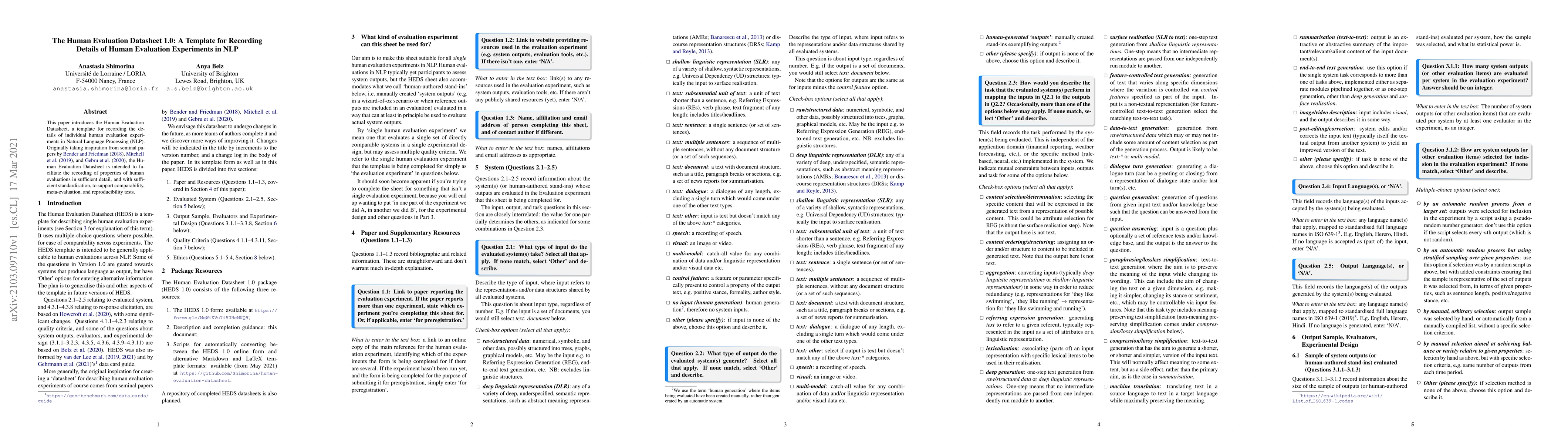 This paper introduces the Human Evaluation Datasheet, a template for recording the details of individual human evaluation experiments in Natural Language Processing (NLP). Originally taking inspiration from seminal papers by Bender and Friedman (2018), Mitchell et al. (2019), and Gebru et al. (2020), the Human Evaluation Datasheet is intended to facilitate the recording of properties of human evaluations in sufficient detail, and with sufficient standardisation, to support comparability, meta-evaluation, and reproducibility tests.