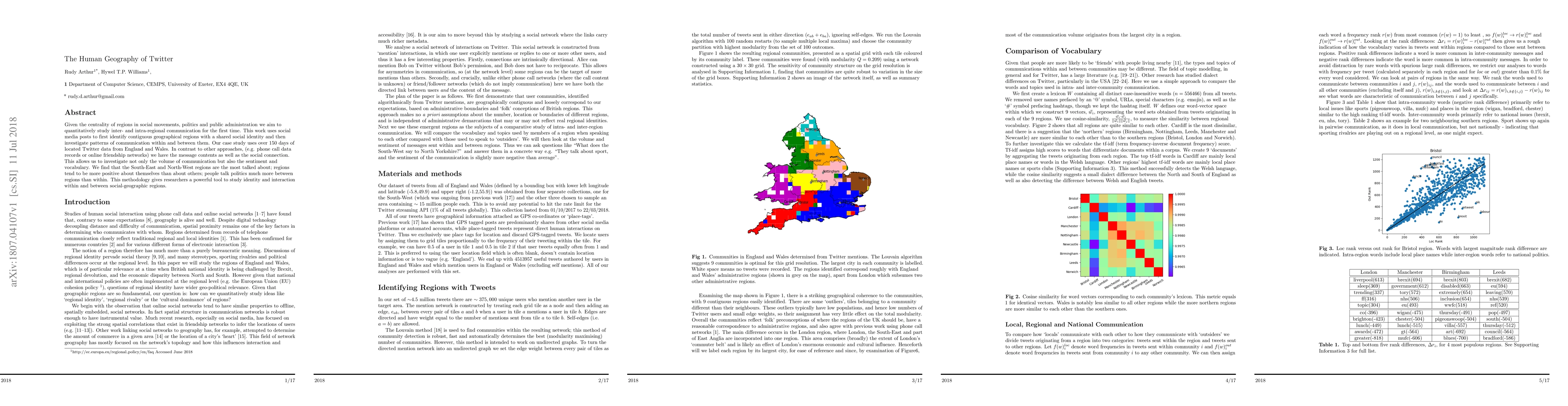 Given the centrality of regions in social movements, politics and public administration we aim to quantitatively study inter- and intra-regional communication for the first time. This work uses social media posts to first identify contiguous geographical regions with a shared social identity and then investigate patterns of communication within and between them. Our case study uses over 150 days of located Twitter data from England and Wales. In contrast to other approaches, (e.g. phone call data records or online friendship networks) we have the message contents as well as the social connection. This allows us to investigate not only the volume of communication but also the sentiment and vocabulary. We find that the South-East and North-West regions are the most talked about; regions tend to be more positive about themselves than about others; people talk politics much more between regions than within. This methodology gives researchers a powerful tool to study identity and interaction within and between social-geographic regions.