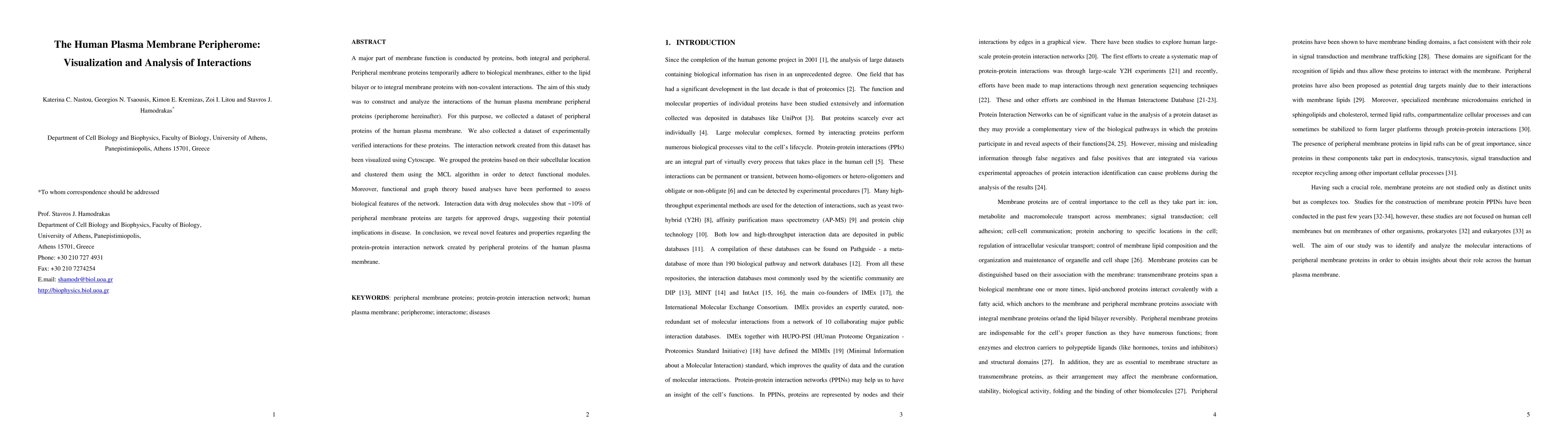A major part of membrane function is conducted by proteins, both integral and peripheral. Peripheral membrane proteins temporarily adhere to biological membranes, either to the lipid bilayer or to integral membrane proteins with non-covalent interactions. The aim of this study was to construct and analyze the interactions of the human plasma membrane peripheral proteins (peripherome hereinafter). For this purpose, we collected a dataset of peripheral proteins of the human plasma membrane. We also collected a dataset of experimentally verified interactions for these proteins. The interaction network created from this dataset has been visualized using Cytoscape. We grouped the proteins based on their subcellular location and clustered them using the MCL algorithm in order to detect functional modules. Moreover, functional and graph theory based analyses have been performed to assess biological features of the network. Interaction data with drug molecules show that ~10% of peripheral membrane proteins are targets for approved drugs, suggesting their potential implications in disease. In conclusion, we reveal novel features and properties regarding the protein-protein interaction network created by peripheral proteins of the human plasma membrane.