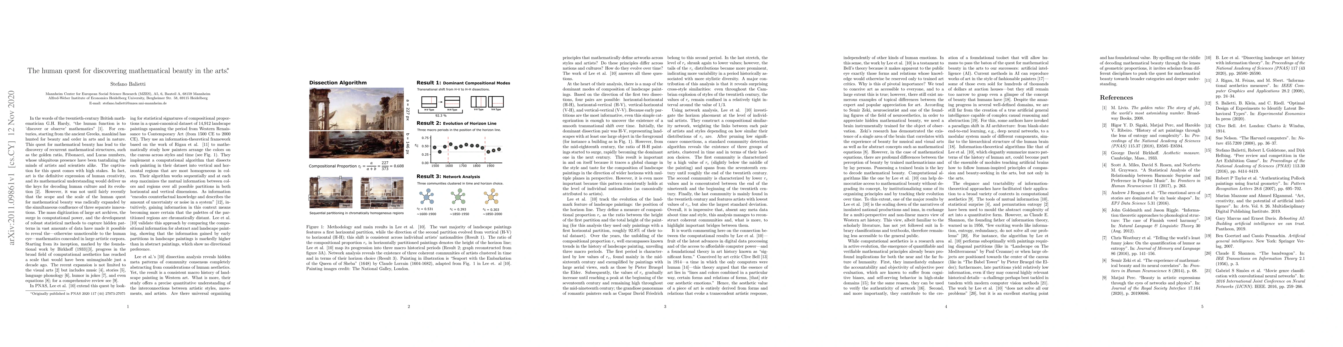 In the words of the twentieth-century British mathematician G. H. Hardy, "the human function is to 'discover or observe' mathematics" (1). For centuries, starting from the ancient Greeks, mankind has hunted for beauty and order in arts and in nature. This quest for mathematical beauty has led to the discovery of recurrent mathematical structures, such as the golden ratio, Fibonacci, and Lucas numbers, whose ubiquitous presences have been tantalizing the minds of artists and scientists alike. The captivation for this quest comes with high stakes. In fact, art is the definitive expression of human creativity, and its mathematical understanding would deliver us the keys for decoding human culture and its evolution (2). However, it was not until fairly recently that the scope and the scale of the human quest for mathematical beauty was radically expanded by the simultaneous confluence of three separate innovations. The mass digitization of large art archives, the surge in computational power, and the development of robust statistical methods to capture hidden patterns in vast amounts of data have made it possible to reveal the---otherwise unnoticeable to the human eye---mathematics concealed in large artistic corpora. Starting from its inception, marked by the foundational work by Birkhoff (3), progress in the broad field of computational aesthetics has reached a scale that would have been unimaginable just a decade ago. The recent expansion is not limited to the visual arts (2) but includes music (4), stories (5), language phonology (6), humor in jokes (7), and even equations (8); for a comprehensive review, see ref. 9.