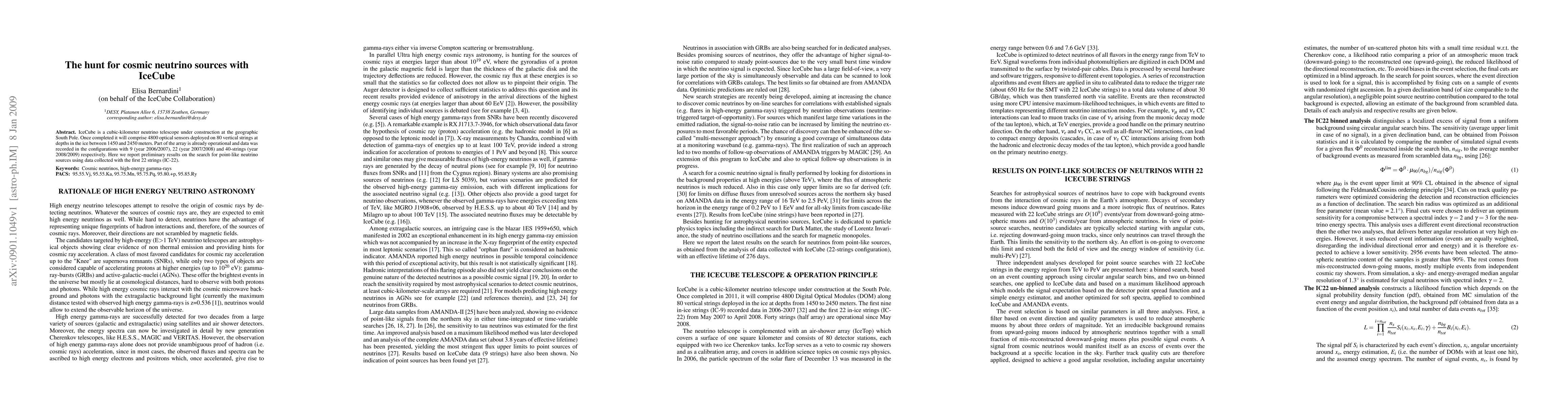 IceCube, a neutrino telescope at the South Pole, has begun collecting data to search for cosmic neutrino sources. Preliminary results from its initial 22-string configuration indicate promising progress in identifying potential point-like neutrino sources.