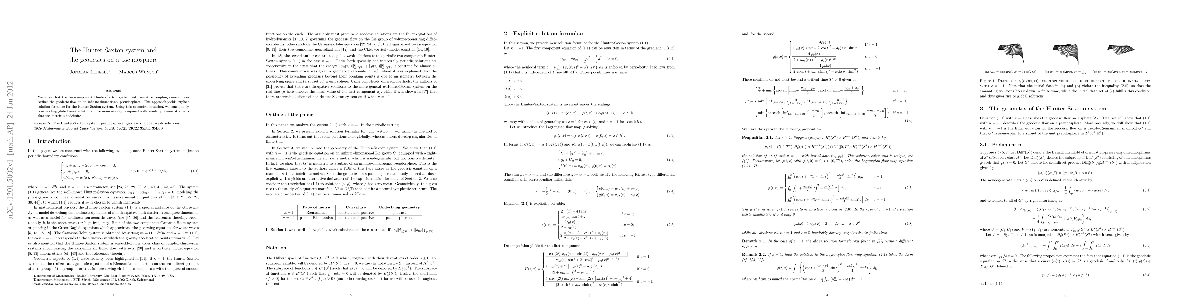 We show that the two-component Hunter-Saxton system with negative coupling constant describes the geodesic flow on an infinite-dimensional pseudosphere. This approach yields explicit solution formulae for the Hunter-Saxton system. Using this geometric intuition, we conclude by constructing global weak solutions. The main novelty compared with similar previous studies is that the metric is indefinite.