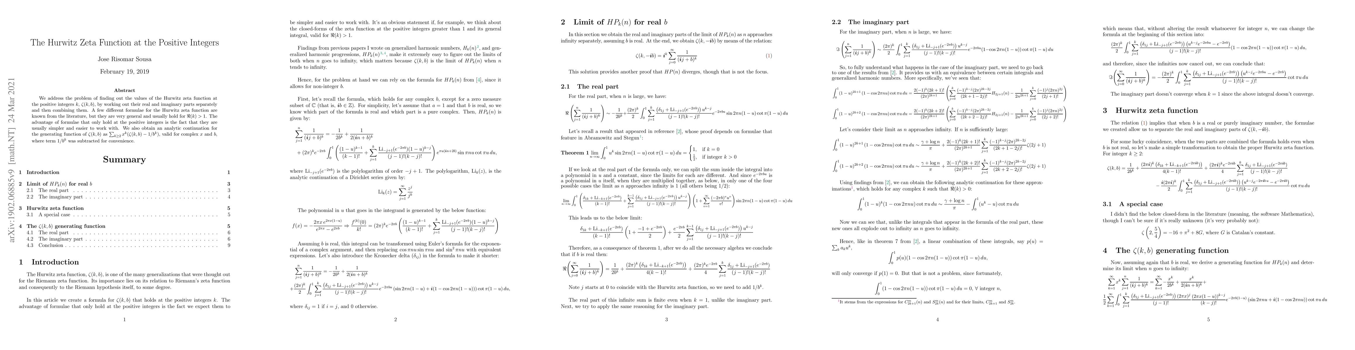 This paper derives specific, simpler expressions for the Hurwitz zeta function $\zeta(k,b)$ at positive integers $k$, providing separate real and imaginary parts. It also presents an analytic continuation for the generating function, enhancing its applicability for complex values of $x$ and $b$.