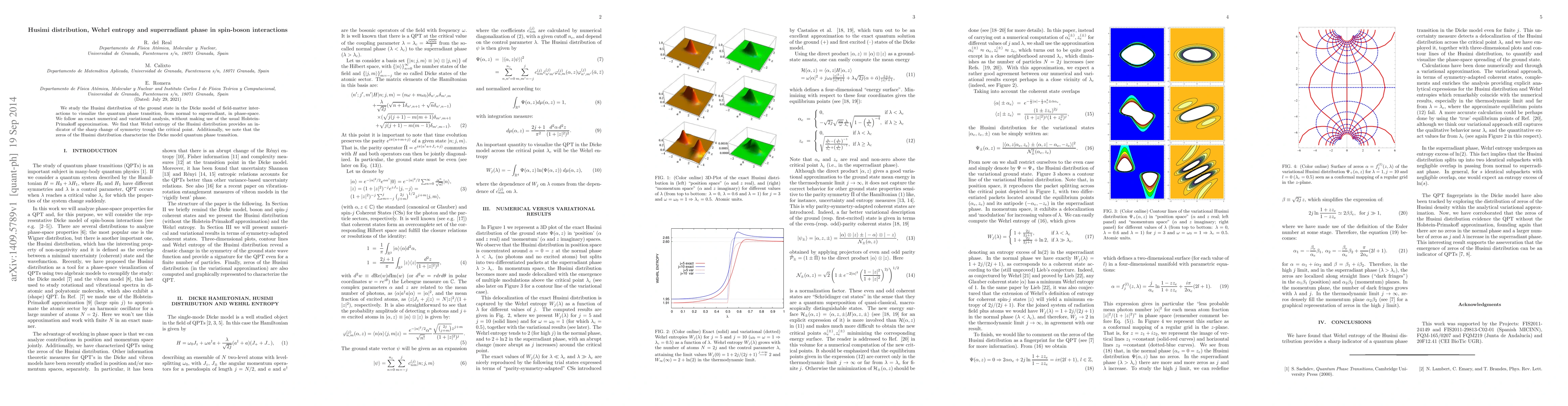 We study the Husimi distribution of the ground state in the Dicke model of field-matter interactions to visualize the quantum phase transition, from normal to superradiant, in phase-space. We follow an exact numerical and variational analysis, without making use of the usual Holstein-Primakoff approximation. We find that Wehrl entropy of the Husimi distribution provides an indicator of the sharp change of symmetry trough the critical point. Additionally, we note that the zeros of the Husimi distribution characterize the Dicke model quantum phase transition.