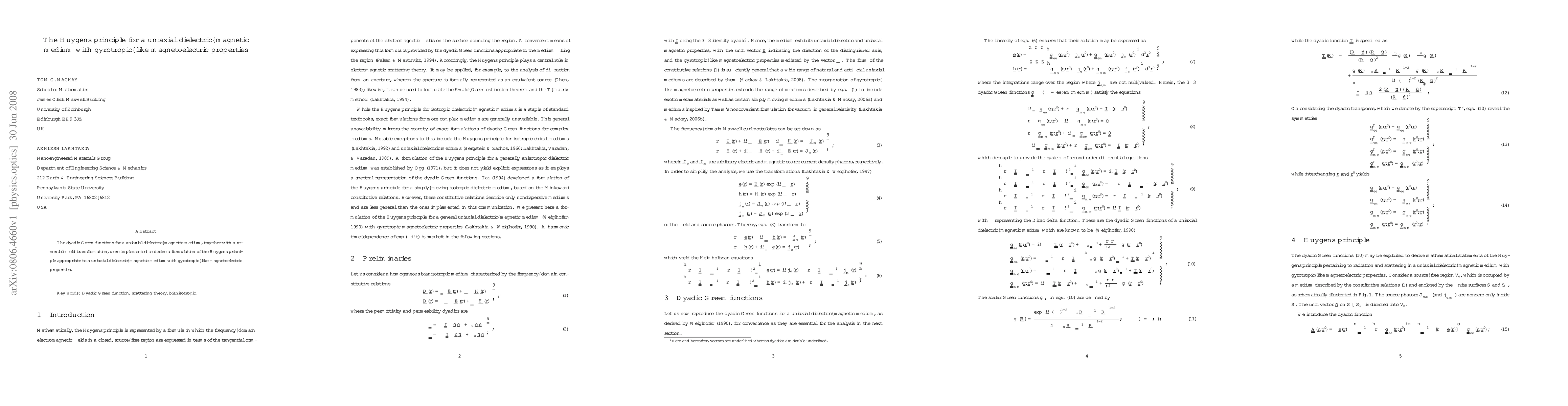This paper derives a Huygens principle for a uniaxial dielectric-magnetic medium with gyrotropic-like magnetoelectric properties using dyadic Green functions and a reversible field transformation. The study provides a new formulation suitable for such complex anisotropic materials.