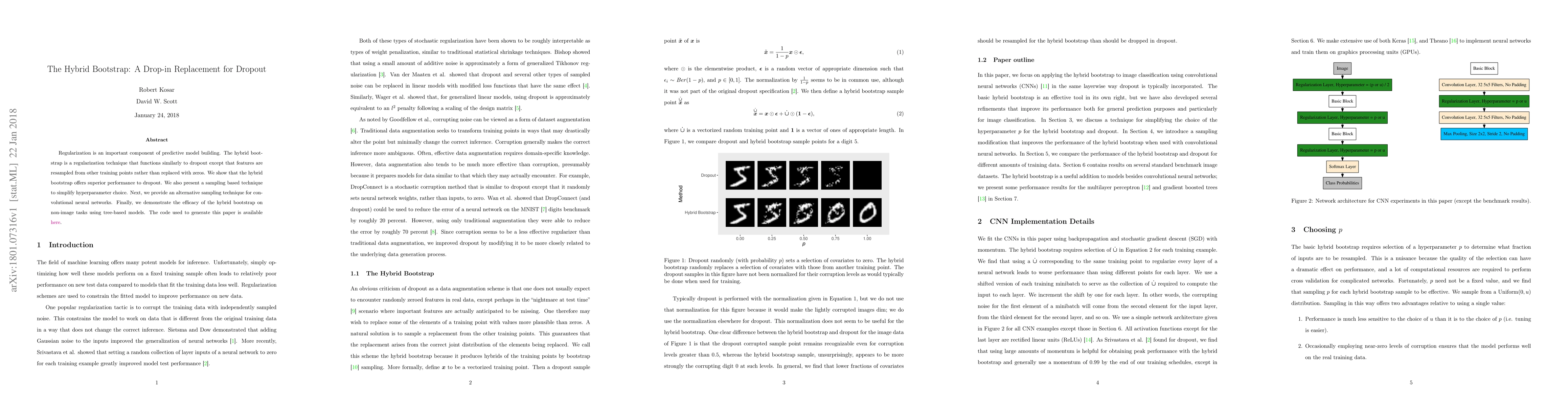 The hybrid bootstrap is a regularization method that resamples features from training data, offering superior performance over dropout. It simplifies hyperparameter selection and extends to convolutional neural networks and tree-based models for non-image tasks.
