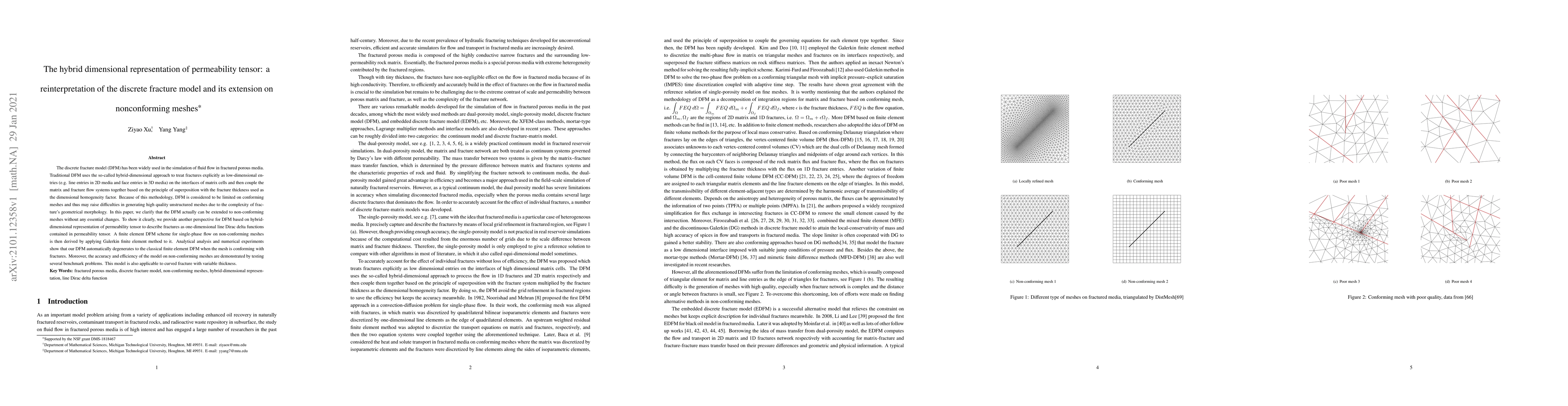 This paper reinterprets the discrete fracture model (DFM) using a hybrid-dimensional representation of permeability tensor, enabling its application on non-conforming meshes without essential changes. The new approach treats fractures as one-dimensional Dirac delta functions, leading to a finite element DFM scheme that maintains accuracy and efficiency on complex, unstructured meshes.