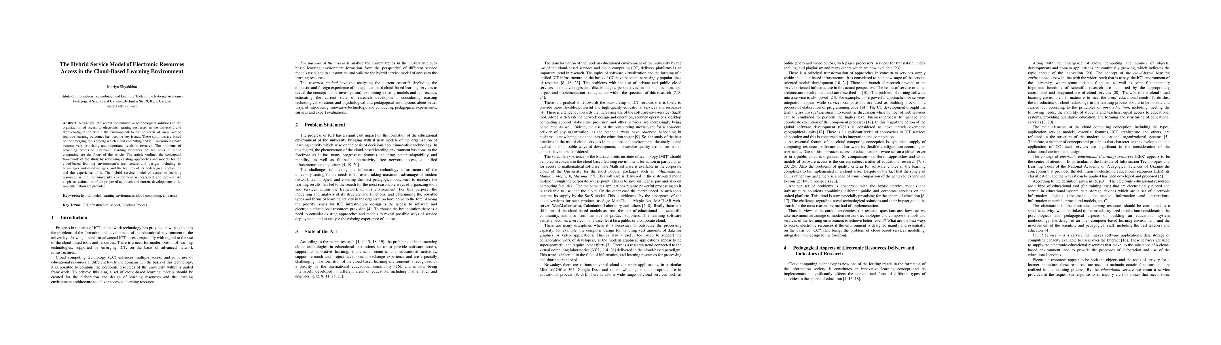 This paper explores the hybrid service model for accessing electronic learning resources in cloud-based learning environments, reviewing existing models and their pedagogical applications. It proposes an innovative approach, supported by empirical estimation, to enhance learning outcomes through improved resource access.