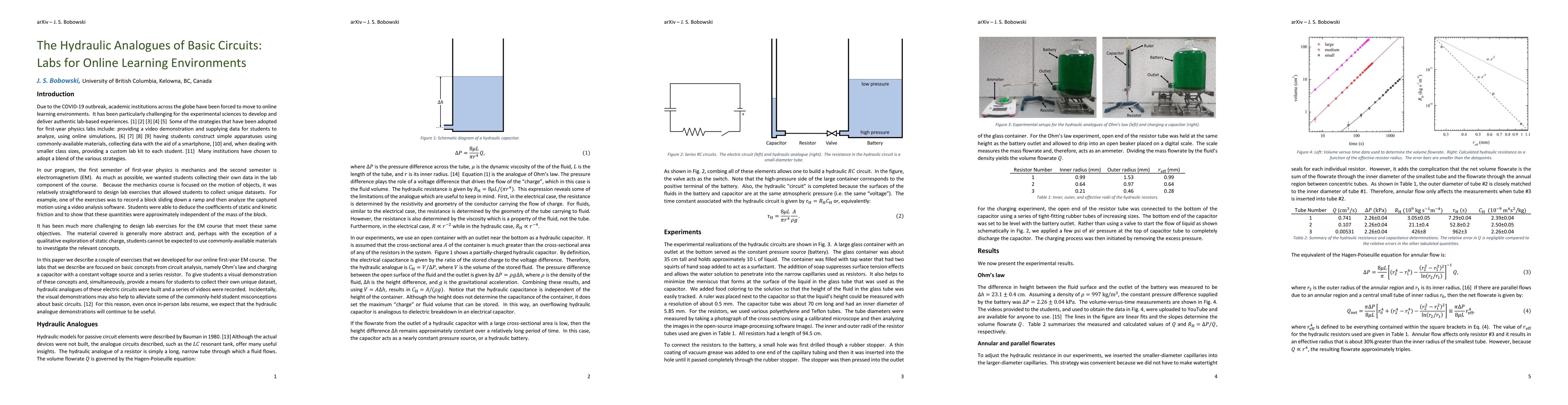 In this paper we describe a couple of exercises that we developed for our online first-year EM course. The labs that we describe are focused on basic concepts from circuit analysis, namely Ohm's law and charging a capacitor with a constant voltage source and a series resistor. To give students a visual demonstration of these concepts and, simultaneously, provide a means for students to collect their own unique dataset, hydraulic analogues of these electric circuits were built and a series of videos were recorded. Incidentally, the visual demonstrations may also help to alleviate some of the commonly-held student misconceptions about basic circuits. For this reason, even once in-person labs resume, we expect that the hydraulic analogue demonstrations will continue to be useful.