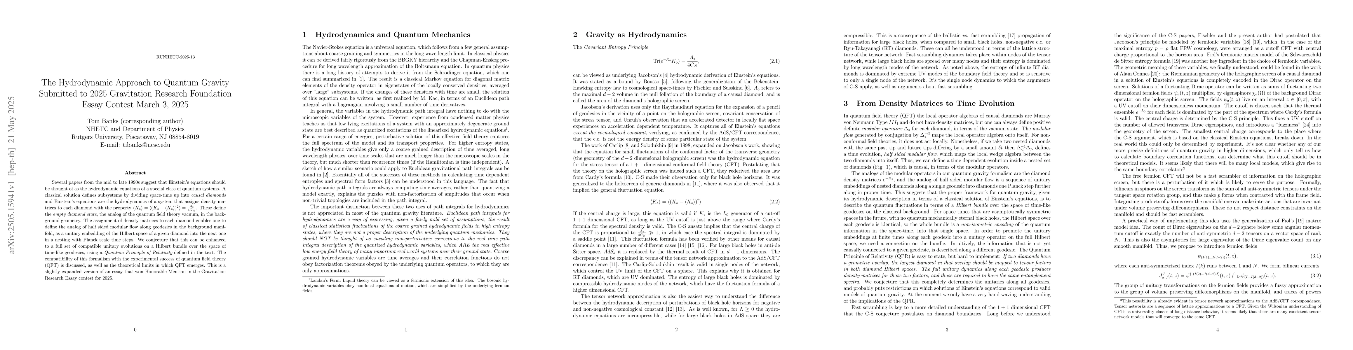 Several papers from the mid to late 1990s suggest that Einstein's equations should be thought of as the hydrodynamic equations of a special class of quantum systems. A classical solution defines subsystems by dividing space-time up into CAUSAL DIAMONDS and Einstein's equations are the hydrodynamics of a system that assigns a density matrix to each diamond whose modular Hamiltonian K has expectation value and fluctuation both given by A/4G. A is the maximal d-2 volume on the boundary of the diamond and G is Newton's constant. These properties define the EMPTY DIAMOND STATE, the analog of the quantum field theory (QFT) vacuum, in the background geometry. The assignment of density matrices to each diamond enables one to define the analog of half sided modular flow along geodesics in the background manifold, as a unitary embedding of the Hilbert space of a given diamond into the next one in a nesting with Planck scale time steps. We conjecture that this can be enhanced to a full set of compatible unitary evolutions on a Hilbert bundle of the space of time-like geodesics, using a QUANTUM PRINCIPLE OF EQUIVALENCE defined in the text. The compatibility of this formalism with the experimental success of QFT is discussed, as well as the theoretical mechanism by which QFT emerges from this version of quantum gravity. This is a slightly expanded version of an essay that won Honorable Mention in the Gravitation Research Essay Contest for 2025.