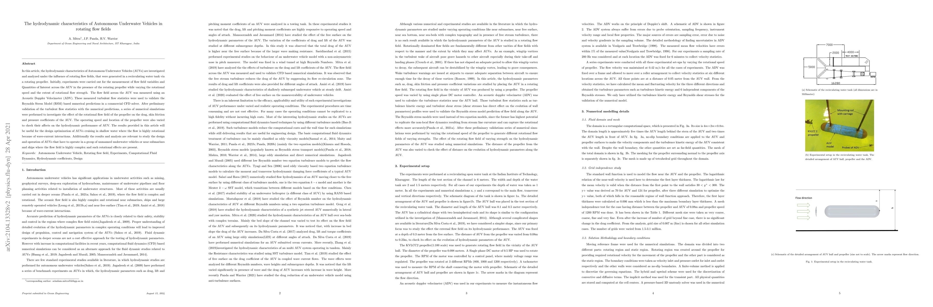 In this article, the hydrodynamic characteristics of Autonomous Underwater Vehicles (AUVs) are investigated and analyzed under the influence of rotating flow fields, that were generated in a recirculating water tank via a rotating propeller. Initially, experiments were carried out for the measurement of flow field variables and Quantities of Interest across the AUV in the presence of the rotating propeller while varying the rotational speed and the extent of rotational flow strength. The flow field across the AUV was measured using an Acoustic Doppler Velocimeter (ADV). These measured turbulent flow statistics were used to validate the Reynolds Stress Model (RSM) based numerical predictions in a commercial CFD solver. After preliminary validation of the turbulent flow statistics with the numerical predictions, a series of numerical simulations were performed to investigate the effect of the rotational flow field of the propeller on the drag, skin friction and pressure coefficients of the AUV. The operating speed and location of the propeller were also varied to check their affects on the hydrodynamic performance of AUV. The results provided in this article will be useful for the design optimization of AUVs cruising in shallow water where the flow is highly rotational because of wave-current interactions. Additionally the results and analysis are relevant to study the design and operation of AUVs that have to operate in a group of unmanned underwater vehicles or near submarines and ships where the flow field is highly complex and such rotational effects are present.