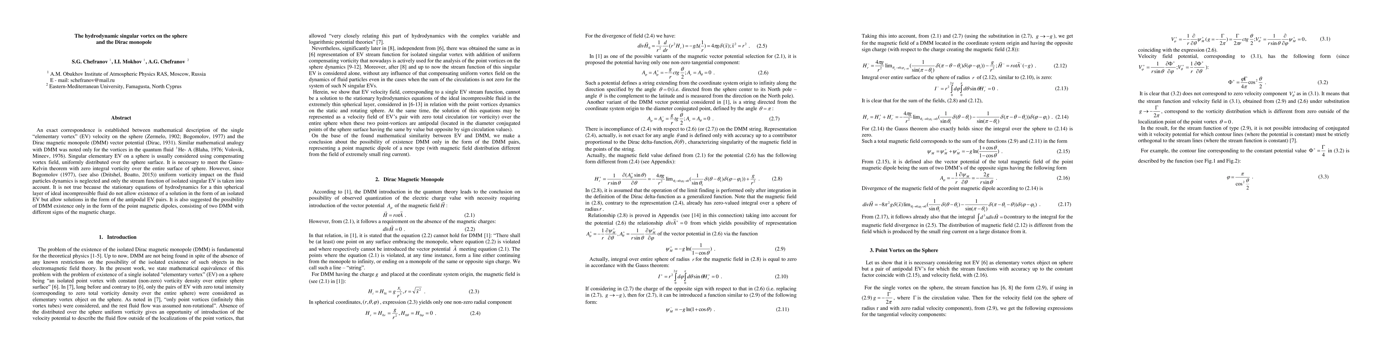 This paper establishes a mathematical correspondence between the hydrodynamic singular vortex on a sphere and the Dirac magnetic monopole, revealing that isolated vortices cannot exist without considering the uniform vorticity field. It suggests that Dirac monopoles may only exist as point magnetic dipoles consisting of two monopoles with opposite charges.