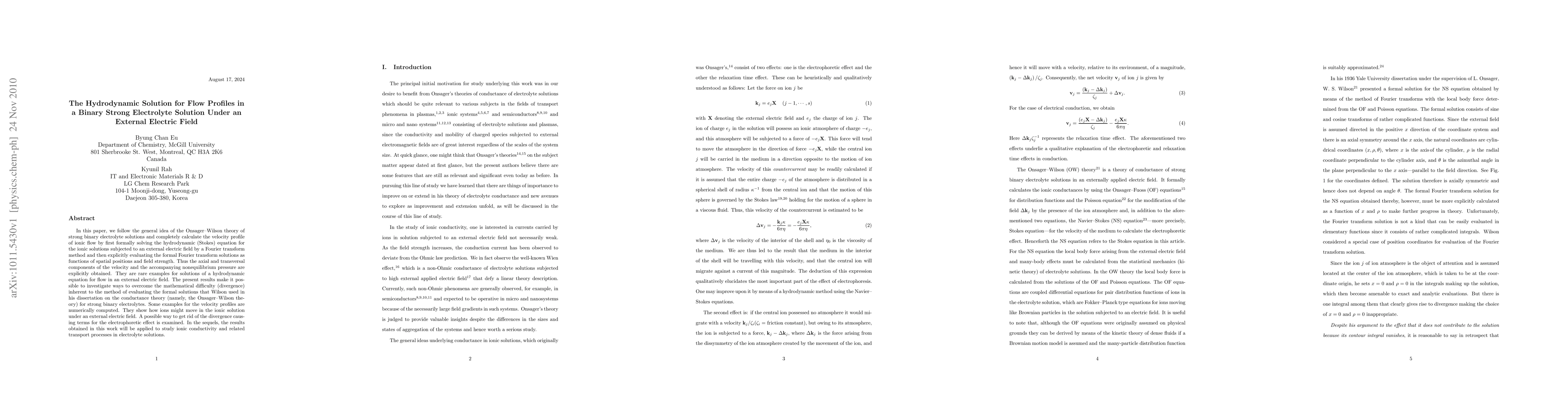 In this paper, we follow the general idea of the Onsager--Wilson theory of strong binary electrolyte solutions and completely calculate the velocity profile of ionic flow by first formally solving the hydrodynamic (Stokes) equation for the ionic solutions subjected to an external electric field by a Fourier transform method and then explicitly evaluating the formal Fourier transform solutions as functions of spatial positions and field strength. Thus the axial and transversal components of the velocity and the accompanying nonequilibrium pressure are explicitly obtained. They are rare examples for solutions of a hydrodynamic equation for flow in an external electric field. The present results make it possible to investigate ways to overcome the mathematical difficulty (divergence) inherent to the method of evaluating the formal solutions that Wilson used in his dissertation on the conductance theory (namely, the Onsager--Wilson theory) for strong binary electrolytes. Some examples for the velocity profiles are numerically computed. They show how ions might move in the ionic solution under an external electric field. A possible way to get rid of the divergence causing terms for the electrophoretic effect is examined. In the sequels, the results obtained in this work will be applied to study ionic conductivity and related transport processes in electrolyte solutions.