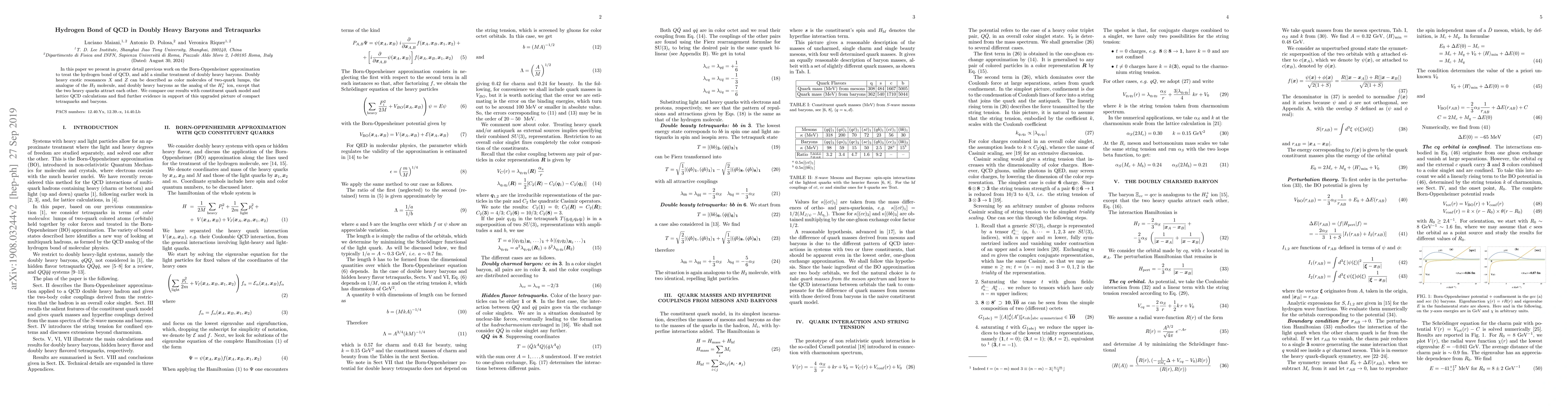 In this paper we present in greater detail previous work on the Born-Oppenheimer approximation to treat the hydrogen bond of QCD, and add a similar treatment of doubly heavy baryons. Doubly heavy exotic resonances X and Z can be described as color molecules of two-quark lumps, the analogue of the H_2 molecule, and doubly heavy baryons as the analog of the H_2^+ ion, except that the two heavy quarks attract each other. We compare our results with constituent quark model and lattice QCD calculations and find further evidence in support of this upgraded picture of compact tetraquarks and baryons.