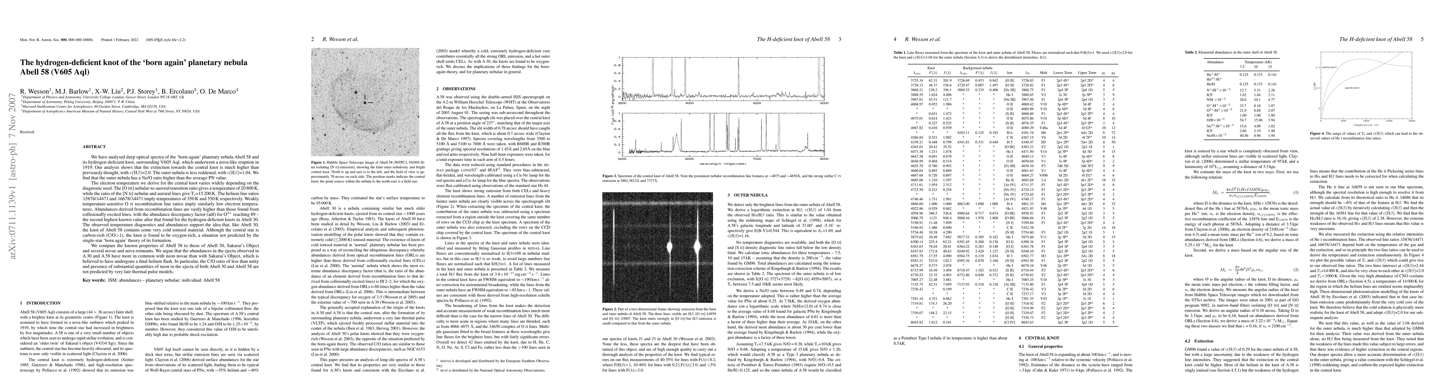 This paper analyzes the hydrogen-deficient knot in the planetary nebula Abell 58, revealing varied electron temperatures and high abundance discrepancies. The knot contains cold ionized material and is oxygen-rich, challenging the single-star "born again" formation theory and suggesting a connection to neon novae instead.