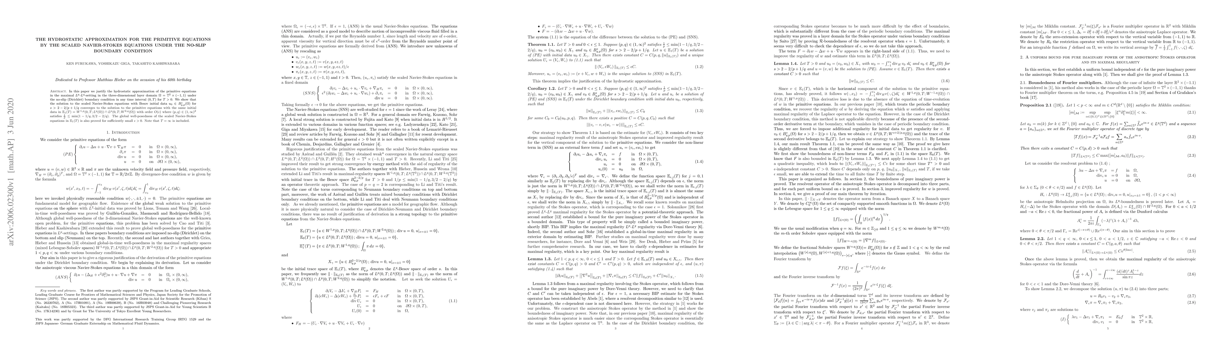 In this paper we justify the hydrostatic approximation of the primitive equations in the maximal $L^p$-$L^q$-setting in the three-dimensional layer domain $\Omega = \Torus^2 \times (-1, 1)$ under the no-slip (Dirichlet) boundary condition in any time interval $(0, T)$ for $T>0$. We show that the solution to the scaled Navier-Stokes equations with Besov initial data $u_0 \in B^{s}_{q,p}(\Omega)$ for $s > 2 - 2/p + 1/ q$ converges to the solution to the primitive equations with the same initial data in $\mathbb{E}_1 (T) = W^{1, p}(0, T ; L^q (\Omega)) \cap L^p(0, T ; W^{2, q} (\Omega)) $ with order $O(\epsilon)$ where $(p,q) \in (1,\infty)^2$ satisfies $ \frac{1}{p} \leq \min \bracket{ 1 - 1/q, 3/2 - 2/q }$. The global well-posedness of the scaled Navier-Stokes equations in $\mathbb{E}_1 (T)$ is also proved for sufficiently small $\epsilon>0$. Note that $T = \infty$ is included.