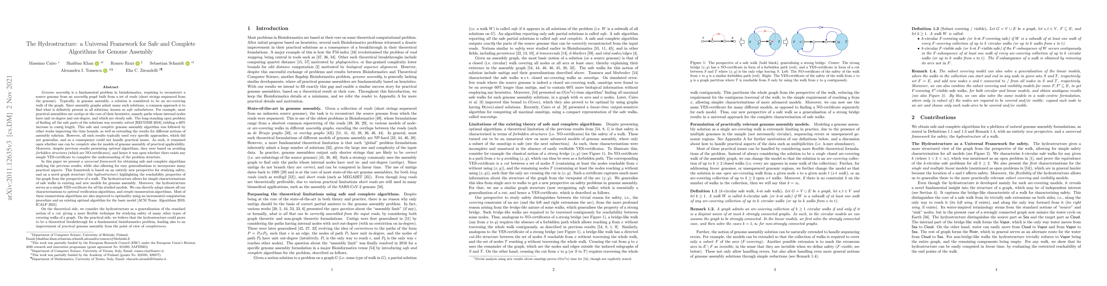 Genome assembly is a fundamental problem in Bioinformatics, requiring to reconstruct a source genome from an assembly graph built from a set of reads (short strings sequenced from the genome). A notion of genome assembly solution is that of an arc-covering walk of the graph. Since assembly graphs admit many solutions, the goal is to find what is definitely present in all solutions, or what is safe. Most practical assemblers are based on heuristics having at their core unitigs, namely paths whose internal nodes have unit in-degree and out-degree, and which are clearly safe. The long-standing open problem of finding all the safe parts of the solutions was recently solved [RECOMB 2016] yielding a 60% increase in contig length. This safe and complete genome assembly algorithm was followed by other works improving the time bounds, as well as extending the results for different notions of assembly solution. But it remained open whether one can be complete also for models of genome assembly of practical applicability. In this paper we present a universal framework for obtaining safe and complete algorithms which unify the previous results, while also allowing for easy generalisations to assembly problems including many practical aspects. This is based on a novel graph structure, called the hydrostructure of a walk, which highlights the reachability properties of the graph from the perspective of the walk. The hydrostructure allows for simple characterisations of the existing safe walks, and of their new practical versions. Almost all of our characterisations are directly adaptable to optimal verification algorithms, and simple enumeration algorithms. Most of these algorithms are also improved to optimality using an incremental computation procedure and a previous optimal algorithm of a specific model.