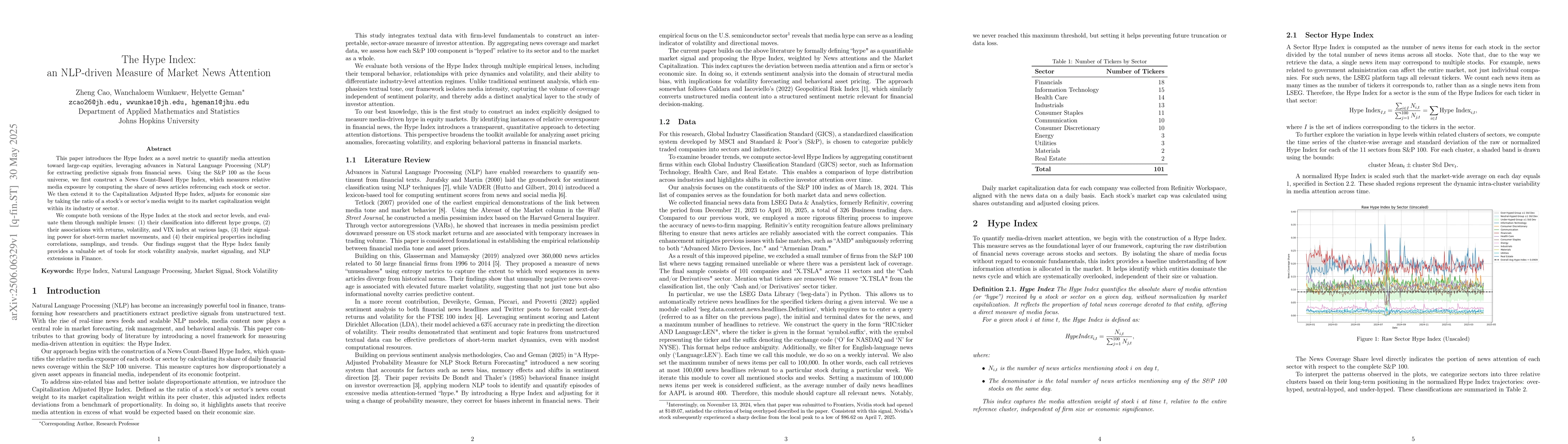 A new metric called the Hype Index measures media attention to large-cap equities using NLP, providing tools for stock volatility analysis and market signaling.