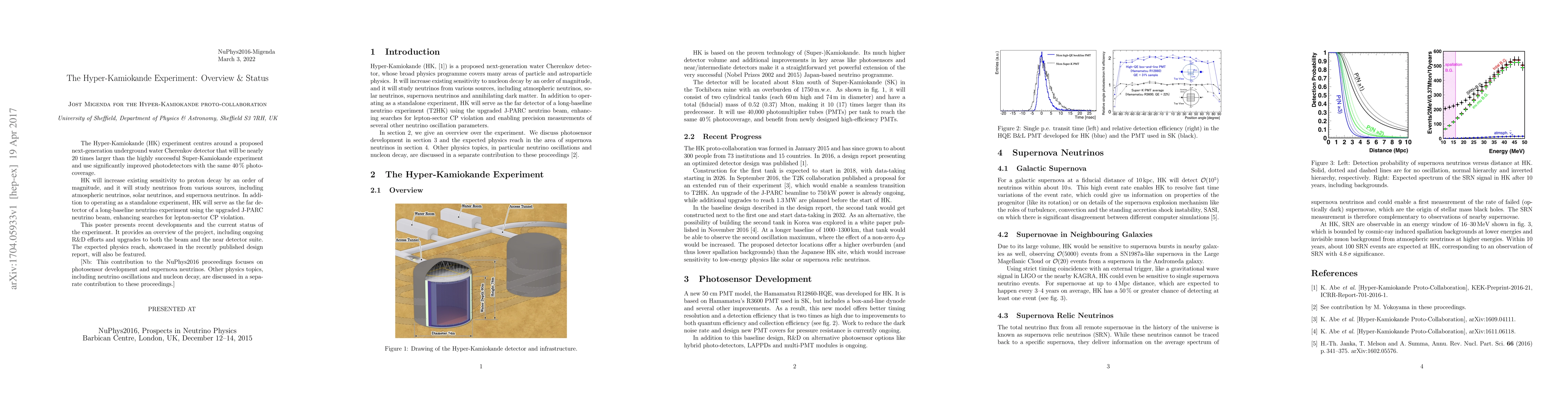 The Hyper-Kamiokande (HK) experiment is a next-generation underground water Cherenkov detector, nearly 20 times larger than Super-Kamiokande, aiming to significantly enhance proton decay sensitivity and study neutrinos from various sources. The current status includes advancements in photosensor R&D and a focus on supernova neutrino detection.