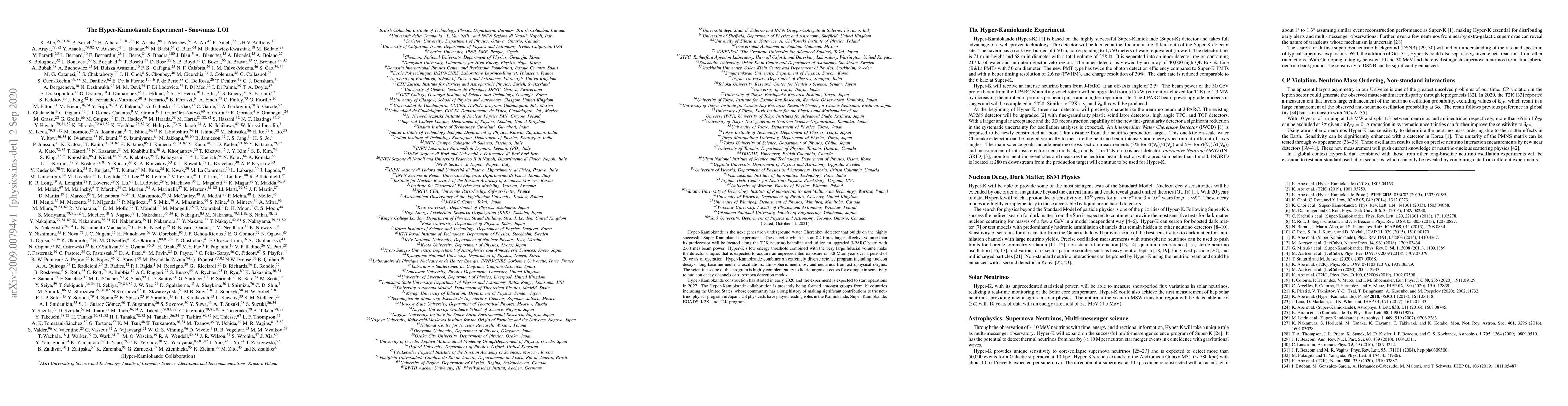Hyper-Kamiokande is the next generation underground water Cherenkov detector that builds on the highly successful Super-Kamiokande experiment. The detector which has an 8.4~times larger effective volume than its predecessor will be located along the T2K neutrino beamline and utilize an upgraded J-PARC beam with 2.6~times beam power. Hyper-K's low energy threshold combined with the very large fiducial volume make the detector unique, that is expected to acquire an unprecedented exposure of 3.8~Mton$\cdot$year over a period of 20~years of operation. Hyper-Kamiokande combines an extremely diverse science program including nucleon decays, long-baseline neutrino oscillations, atmospheric neutrinos, and neutrinos from astrophysical origins. The scientific scope of this program is highly complementary to liquid-argon detectors for example in sensitivity to nucleon decay channels or supernova detection modes. Hyper-Kamiokande construction has started in early 2020 and the experiment is expected to start operations in 2027. The Hyper-Kamiokande collaboration is presently being formed amongst groups from 19 countries including the United States, whose community has a long history of making significant contributions to the neutrino physics program in Japan. US physicists have played leading roles in the Kamiokande, Super-Kamiokande, EGADS, K2K, and T2K programs.