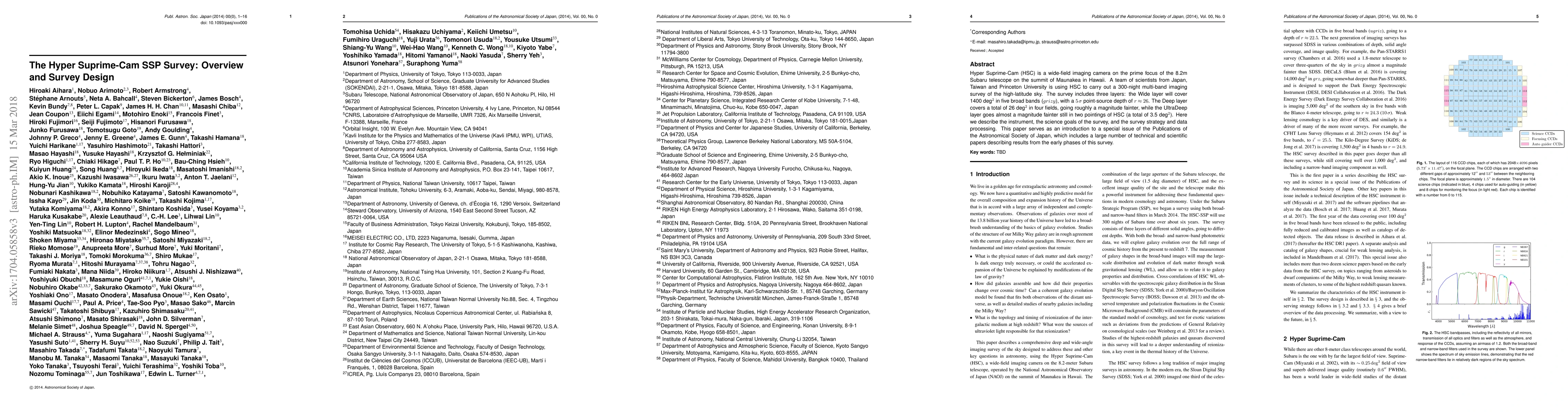 The Hyper Suprime-Cam SSP Survey utilizes the HSC camera on the Subaru telescope to conduct a comprehensive multi-band imaging survey of the high-latitude sky, comprising three layers: Wide, Deep, and UltraDeep, with varying depths and coverages. This paper outlines the survey design, instrument details, and science goals.