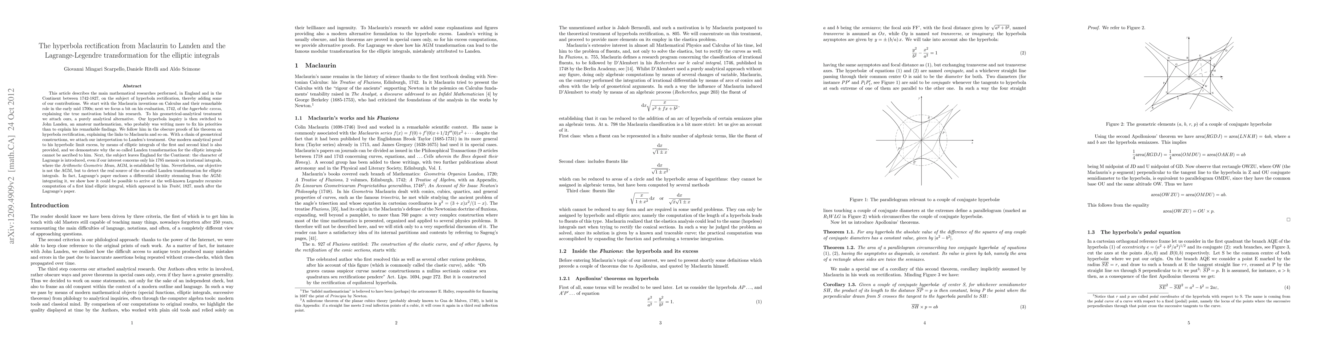 This article describes the main mathematical researches performed, in England and in the Continent between 1742-1827, on the subject of hyperbola rectification, thereby adding some of our contributions. We start with the Maclaurin inventions on Calculus and their remarkable role in the early mid 1700s; next we focus a bit on his evaluation, 1742, of the hyperbolic excess, explaining the true motivation behind his research. To his geometrical-analytical treatment we attach ours, a purely analytical alternative. Our hyperbola inquiry is then switched to John Landen, an amateur mathematician, who probably was writing more to fix his priorities than to explain his remarkable findings. We follow him in the obscure proofs of his theorem on hyperbola rectification, explaining the links to Maclaurin and so on. With a chain of geometrical constructions, we attach our interpretation to Landen's treatment. Our modern analytical proof to his hyperbolic limit excess, by means of elliptic integrals of the first and second kind is also provided, and we demonstrate why the so called Landen transformation for the elliptic integrals cannot be ascribed to him. Next, the subject leaves England for the Continent: the character of Lagrange is introduced, even if our interest concerns only his 1785 memoir on irrational integrals, where the Arithmetic Geometric Mean, AGM, is established by him. Nevertheless, our objective is not the AGM, but to detect the real source of the so-called Landen transformation for elliptic integrals. In fact, Lagrange's paper encloses a differential identity stemming from the AGM: integrating it, we show how it could be possible to arrive at the well-known Legendre recursive computation of a first kind elliptic integral, which appeared in his Trait\'e, 1827, much after the Lagrange's paper.