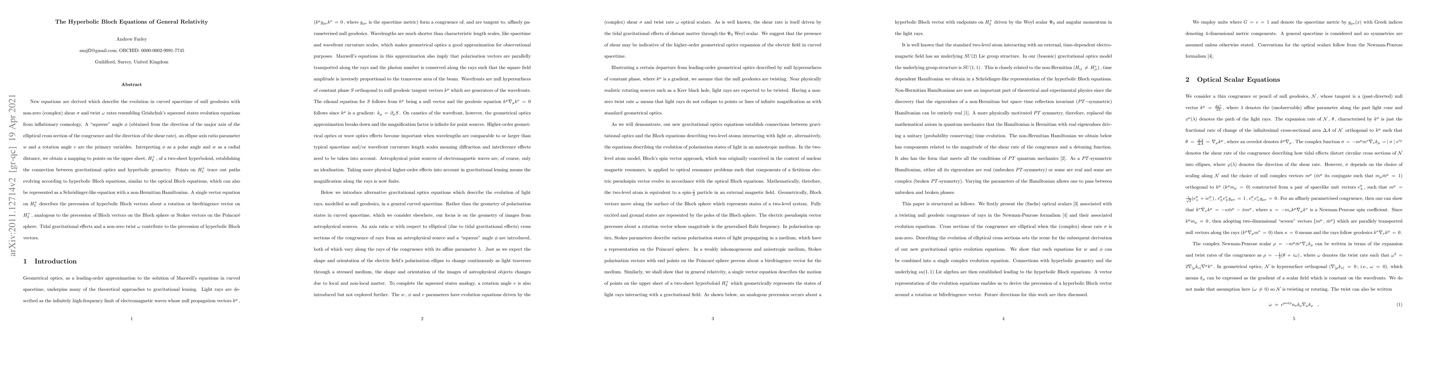 New equations are derived which describe the evolution in curved spacetime of null geodesics with non-zero (complex) shear $\sigma$ and twist $\omega$ rates resembling Grishchuk's squeezed states evolution equations from inflationary cosmology. A ``squeeze" angle $\phi$ (obtained from the direction of the major axis of the elliptical cross section of the congruence and the direction of the shear rate), an ellipse axis ratio parameter $w$ and a rotation angle $v$ are the primary variables. Interpreting $\phi$ as a polar angle and $w$ as a radial distance, we obtain a mapping to points on the upper sheet, $H_{2}^{+}\,,$ of a two-sheet hyperboloid, establishing the connection between gravitational optics and hyperbolic geometry. Points on $H_{2}^{+}$ trace out paths evolving according to hyperbolic Bloch equations, similar to the optical Bloch equations, which can also be represented as a Schr\"{o}dinger-like equation with a non-Hermitian Hamiltonian. A single vector equation on $H_{2}^{+}$ describes the precession of hyperbolic Bloch vectors about a rotation or birefringence vector on $H_{2}^{+}\,,$ analogous to the precession of Bloch vectors on the Bloch sphere or Stokes vectors on the Poincar\'{e} sphere. Tidal gravitational effects and a non-zero twist $\omega$ contribute to the precession of hyperbolic Bloch vectors.