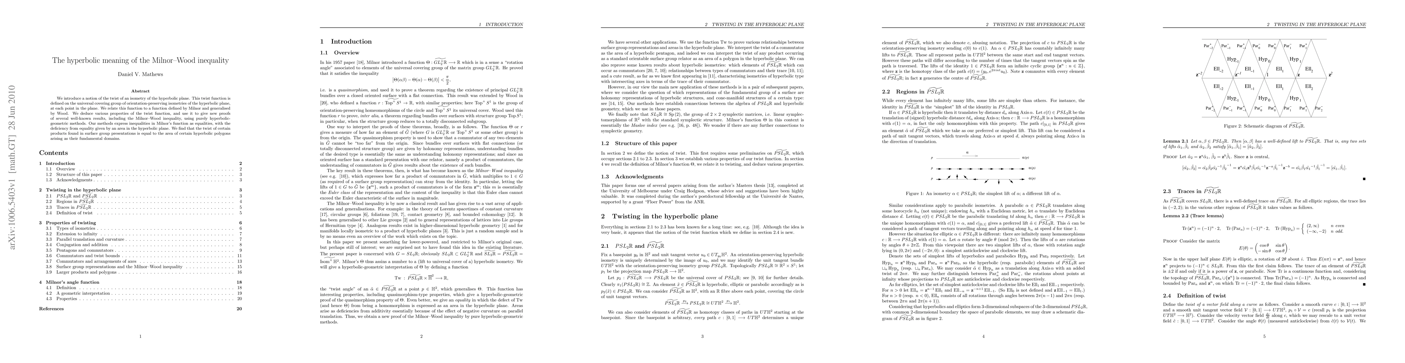 We introduce a notion of the twist of an isometry of the hyperbolic plane. This twist function is defined on the universal covering group of orientation-preserving isometries of the hyperbolic plane, at each point in the plane. We relate this function to a function defined by Milnor and generalised by Wood. We deduce various properties of the twist function, and use it to give new proofs of several well-known results, including the Milnor--Wood inequality, using purely hyperbolic-geometric methods. Our methods express inequalities in Milnor's function as equalities, with the deficiency from equality given by an area in the hyperbolic plane. We find that the twist of certain products found in surface group presentations is equal to the area of certain hyperbolic polygons arising as their fundamental domains.