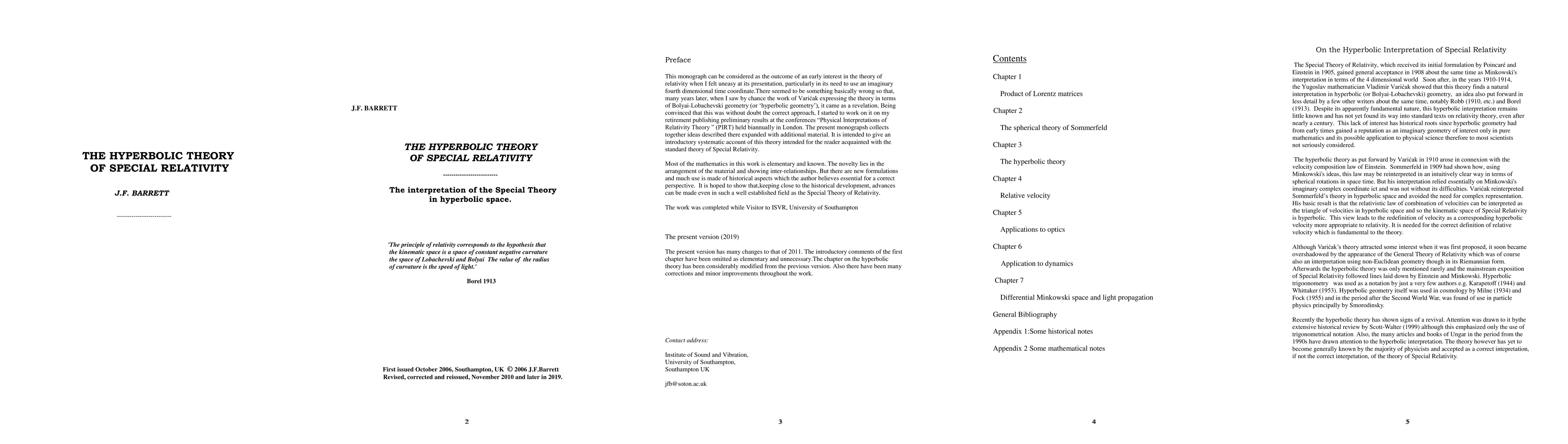 The book is based largely on the author's researches presented at conferences in the period 1992 onwards. It is a historically based exposition and an extension of the hyperbolic version of special relativity first proposed by Vari\'cak (1910 etc) and others not long after the appearance of the early papers of Einstein and Minkowski. The book's approach puts emphasis on the concept of hyperbolic velocity (scaled rapidity) and in this respect differs markedly from the gyro theory of Ungar. New formulations are given in optics relating hyperbolic velocity with logarithmic redshift and in dynamics including a reformulation of Newton's 2nd law in terms of hyperbolic acceleration so avoiding velocity-dependent mass. The concept of differential Minkowski space is introduced and related to the hyperbolic theory and to Carath\'eodory's axiomatic approach to the special theory.