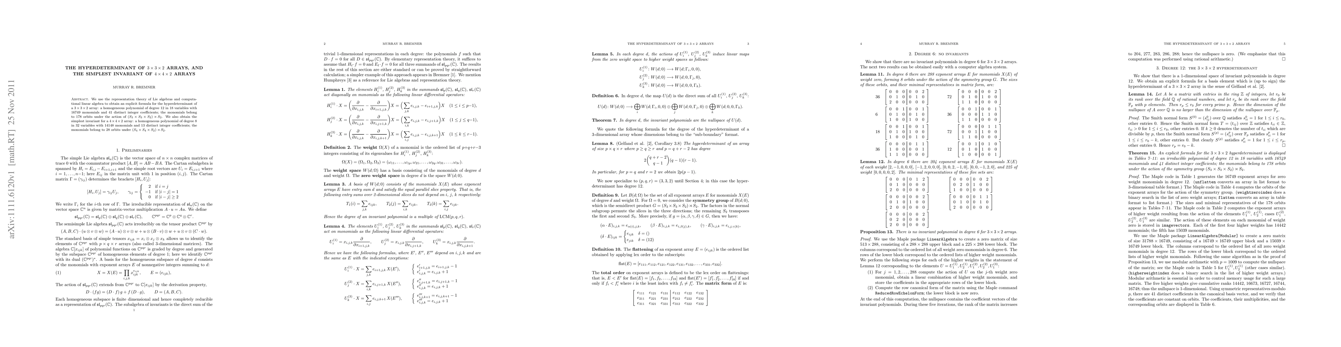 We use the representation theory of Lie algebras and computational linear algebra to obtain an explicit formula for the hyperdeterminant of a $3 \times 3 \times 2$ array: a homogeneous polynomial of degree 12 in 18 variables with 16749 monomials and 41 distinct integer coefficients; the monomials belong to 178 orbits under the action of $(S_3 \times S_3 \times S_2) \rtimes S_2$. We also obtain the simplest invariant for a $4 \times 4 \times 2$ array: a homogeneous polynomial of degree 8 in 32 variables with 14148 monomials and 13 distinct integer coefficients; the monomials belong to 28 orbits under $(S_4 \times S_4 \times S_2) \rtimes S_2$.