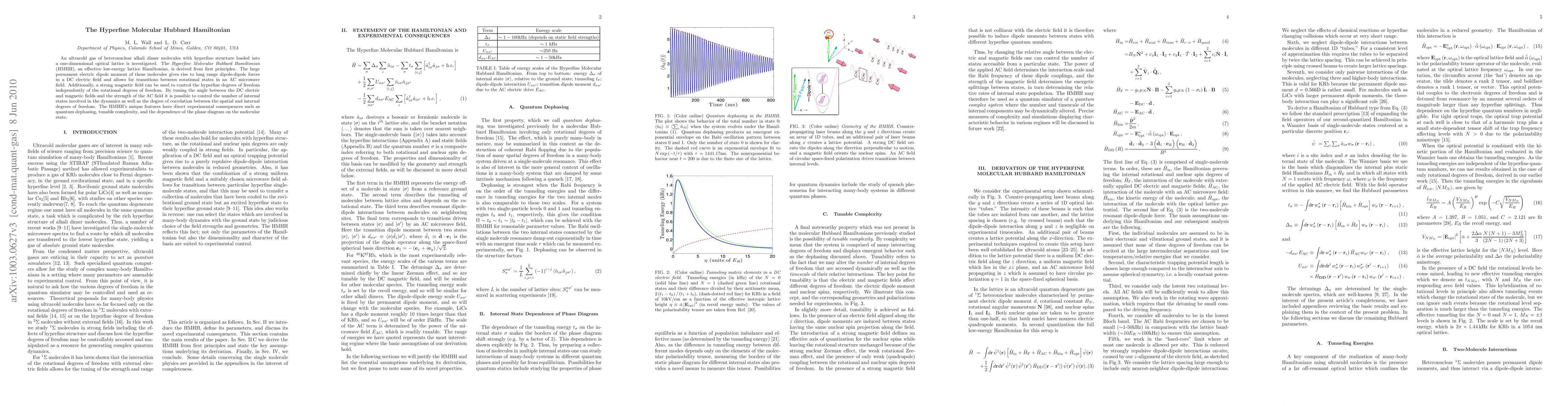 An ultracold gas of heteronuclear alkali dimer molecules with hyperfine structure loaded into a one-dimensional optical lattice is investigated. The \emph{Hyperfine Molecular Hubbard Hamiltonian} (HMHH), an effective low-energy lattice Hamiltonian, is derived from first principles. The large permanent electric dipole moment of these molecules gives rise to long range dipole-dipole forces in a DC electric field and allows for transitions between rotational states in an AC microwave field. Additionally, a strong magnetic field can be used to control the hyperfine degrees of freedom independently of the rotational degrees of freedom. By tuning the angle between the DC electric and magnetic fields and the strength of the AC field it is possible to control the number of internal states involved in the dynamics as well as the degree of correlation between the spatial and internal degrees of freedom. The HMHH's unique features have direct experimental consequences such as quantum dephasing, tunable complexity, and the dependence of the phase diagram on the molecular state.