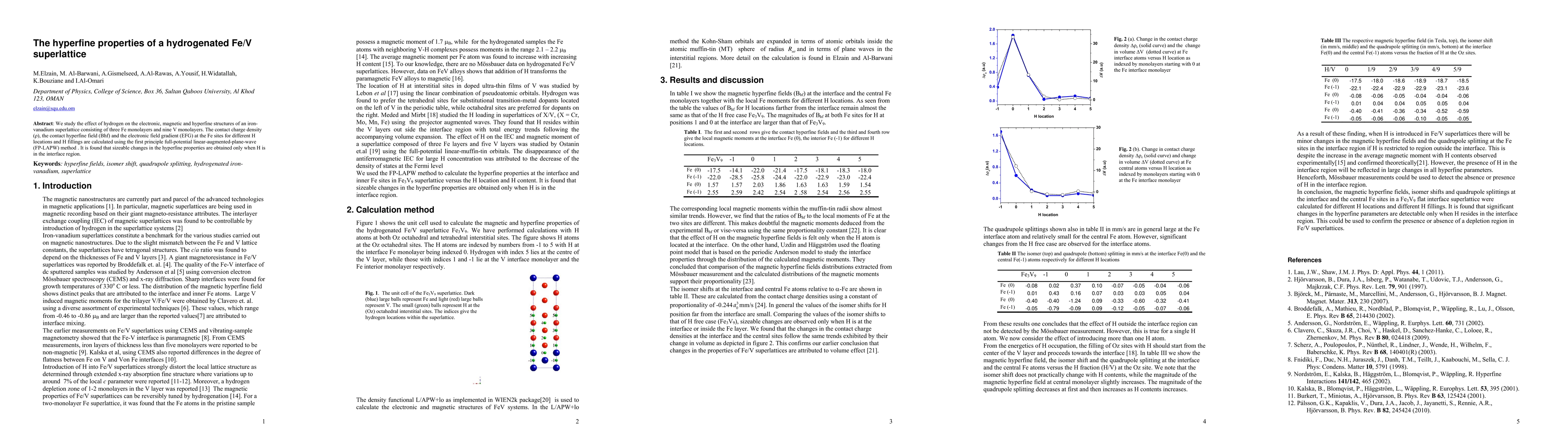 This study investigates the impact of hydrogen on the electronic, magnetic, and hyperfine structures of an Fe/V superlattice using first-principle calculations. The research reveals that significant changes in hyperfine properties occur only when hydrogen is positioned in the interface region between Fe and V layers.