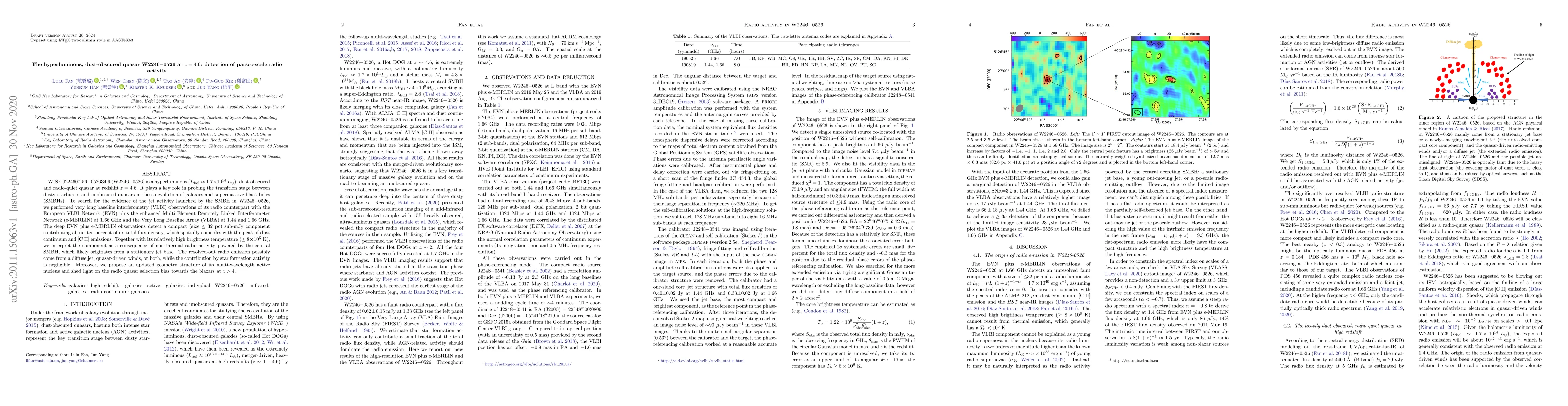 The paper reports the detection of parsec-scale radio activity in the hyperluminous, dust-obscured quasar W2246-0526 at redshift 4.6, revealing a compact, non-thermal radio component likely powered by the central supermassive black hole. This discovery sheds light on the transition between dusty starbursts and unobscured quasars in galaxy evolution.