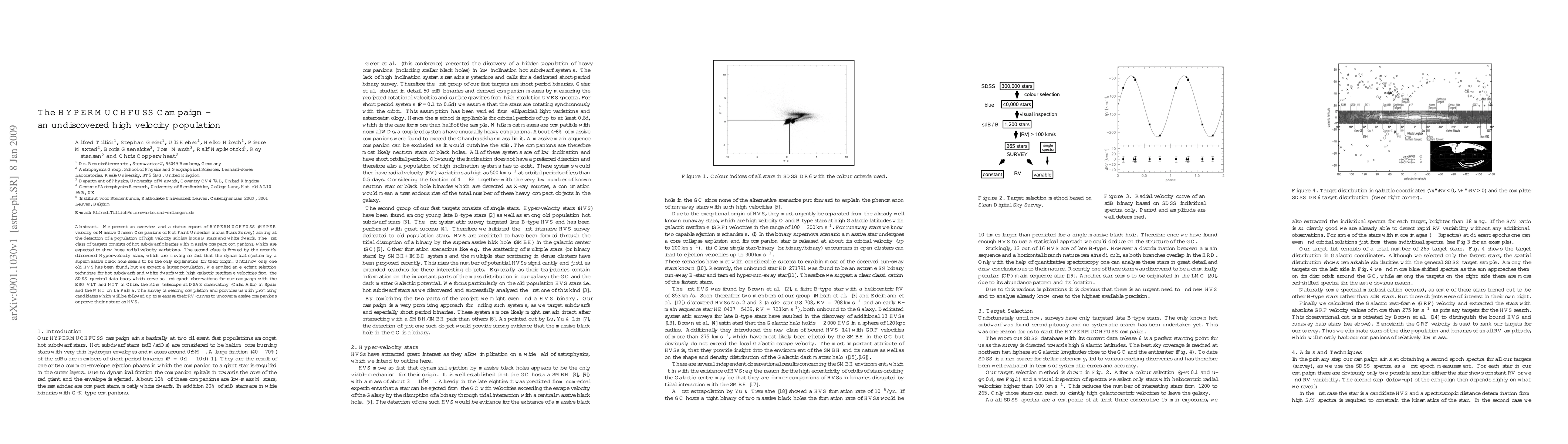 We present an overview and a status report of HYPERMUCHFUSS (HYPER velocity or Massive Unseen Companions of Hot Faint Underluminious Stars Survey) aiming at the detection of a population of high velocity subluminous B stars and white dwarfs. The first class of targets consists of hot subdwarf binaries with massive compact companions, which are expected to show huge radial velocity variations. The second class is formed by the recently discovered hyper-velocity stars, which are moving so fast that the dynamical ejection by a supermassive black hole seems to be the only explanation for their origin. Until now only one old hyper-velocity star has been found, but we expect a larger population. We applied an efficient selection technique for hot subdwarfs and white dwarfs with high galactic restframe velocities from the \emph{SDSS} spectral data base, which serve as first epoch observations for our campaign with the ESO VLT and NTT in Chile, the 3.5 m telescope at DSAZ observatory (Calar Alto) in Spain and the WHT on La Palma. The survey is nearing completion and provides us with promising candidates which will be followed up to measure their RV-curves to uncover massive companions or prove their nature as HVS.