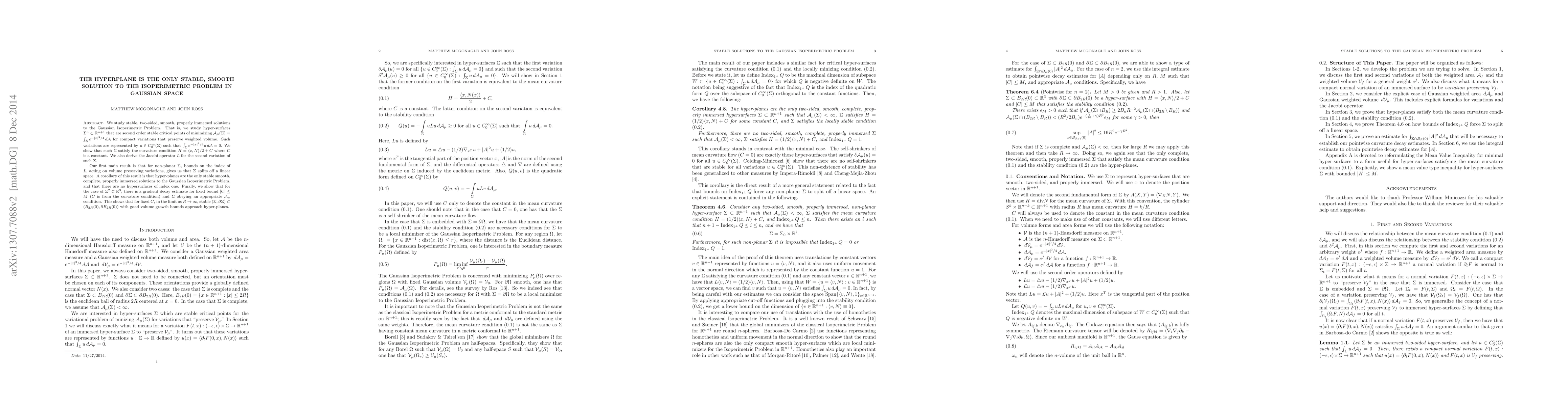 We study stable smooth solutions to the isoperimetric type problem for a Gaussian weight on Euclidean Space. That is, we study hypersurfaces $\Sigma^n \subset \mathbb R^{n+1}$ that are second order stable critical points of compact variations that minimize Gaussian weighted area and preserve Gaussian weighted volume. We show that such $\Sigma$ satisfy a curvature condition, and derive the Jacobi operator $L$ for the second variation of such $\Sigma$. Our first main result is that for non-planar $\Sigma$, bounds on the index of $L$, acting on volume preserving variations, gives us that $\Sigma$ splits off a linear space. A corollary of this result is that hyperplanes are the only stable smooth complete solutions to this Gaussian isoperimetric type problem, and that there are no hypersurfaces of index one. Finally, we show that for the case of $\Sigma^2 \subset \mathbb R^3$, there is a gradient decay estimate depending on bounds for the curvature condition and an appropriate area growth bound. This shows that, in the limit as $R \to \infty$, stable $(\Sigma, \partial\Sigma) \subset (B_{2R}(0), \partial B_{2R}(0))$ with good area growth bounds approach hyperplanes.