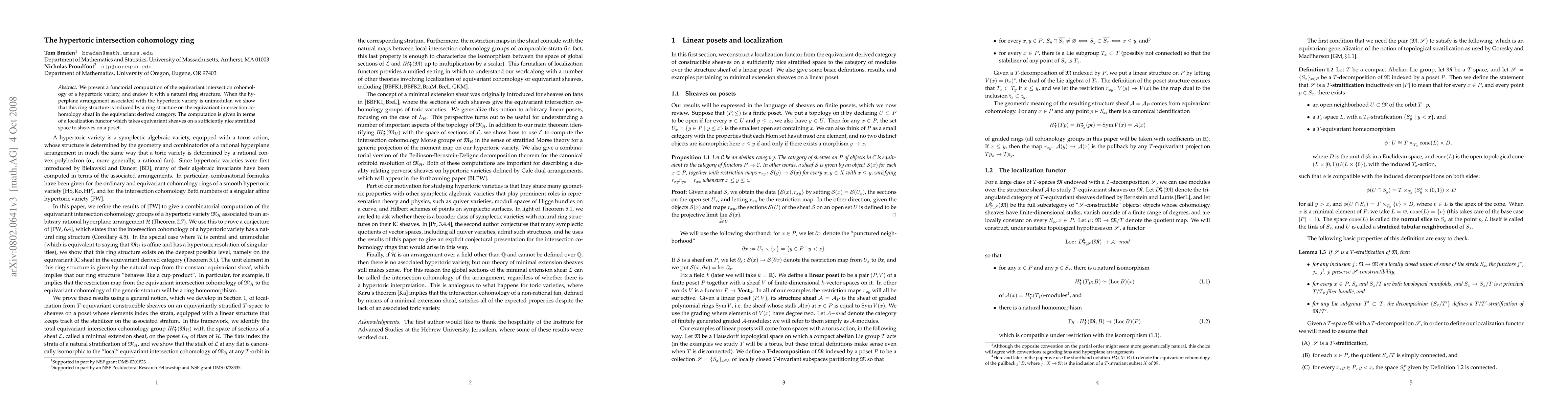 Summary: This paper computes the equivariant intersection cohomology of hypertoric varieties and establishes a natural ring structure for it, showing that this structure arises from the equivariant derived category when the associated hyperplane arrangement is unimodular. The computation leverages a localization functor mapping equivariant sheaves to poset sheaves.