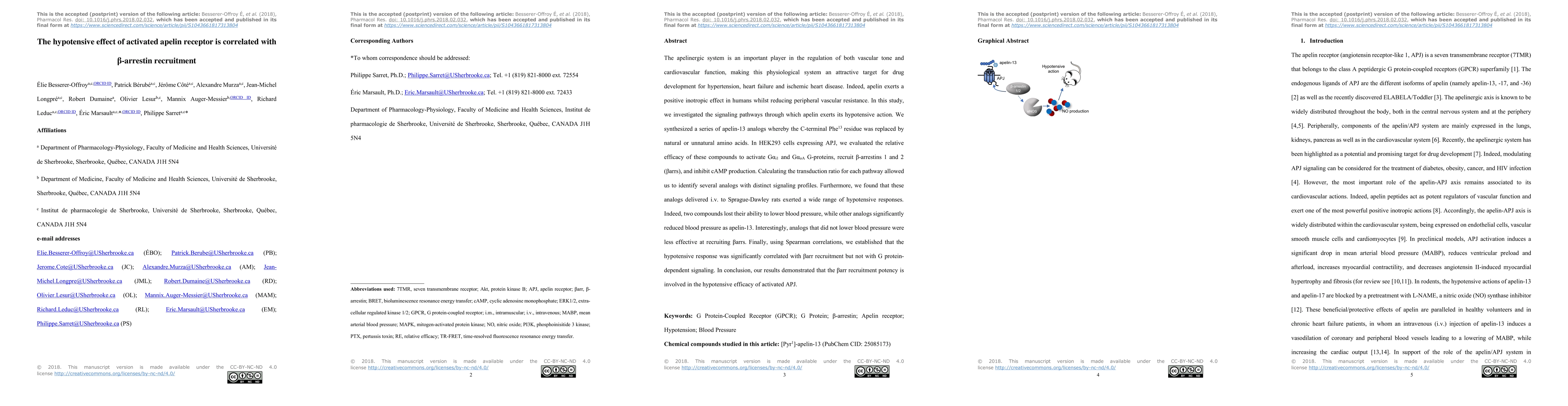 The apelinergic system is an important player in the regulation of both vascular tone and cardiovascular function, making this physiological system an attractive target for drug development for hypertension, heart failure and ischemic heart disease. Indeed, apelin exerts a positive inotropic effect in humans whilst reducing peripheral vascular resistance. In this study, we investigated the signaling pathways through which apelin exerts its hypotensive action. We synthesized a series of apelin-13 analogs whereby the C-terminal Phe13 residue was replaced by natural or unnatural amino acids. In HEK293 cells expressing APJ, we evaluated the relative efficacy of these compounds to activate G{\alpha}i1 and G{\alpha}oA G-proteins, recruit \b{eta}-arrestins 1 and 2 (\b{eta}arrs), and inhibit cAMP production. Calculating the transduction ratio for each pathway allowed us to identify several analogs with distinct signaling profiles. Furthermore, we found that these analogs delivered i.v. to Sprague-Dawley rats exerted a wide range of hypotensive responses. Indeed, two compounds lost their ability to lower blood pressure, while other analogs significantly reduced blood pressure as apelin-13. Interestingly, analogs that did not lower blood pressure were less effective at recruiting \b{eta}arrs. Finally, using Spearman correlations, we established that the hypotensive response was significantly correlated with \b{eta}arr recruitment but not with G protein- dependent signaling. In conclusion, our results demonstrated that the \b{eta}arr recruitment potency is involved in the hypotensive efficacy of activated APJ.