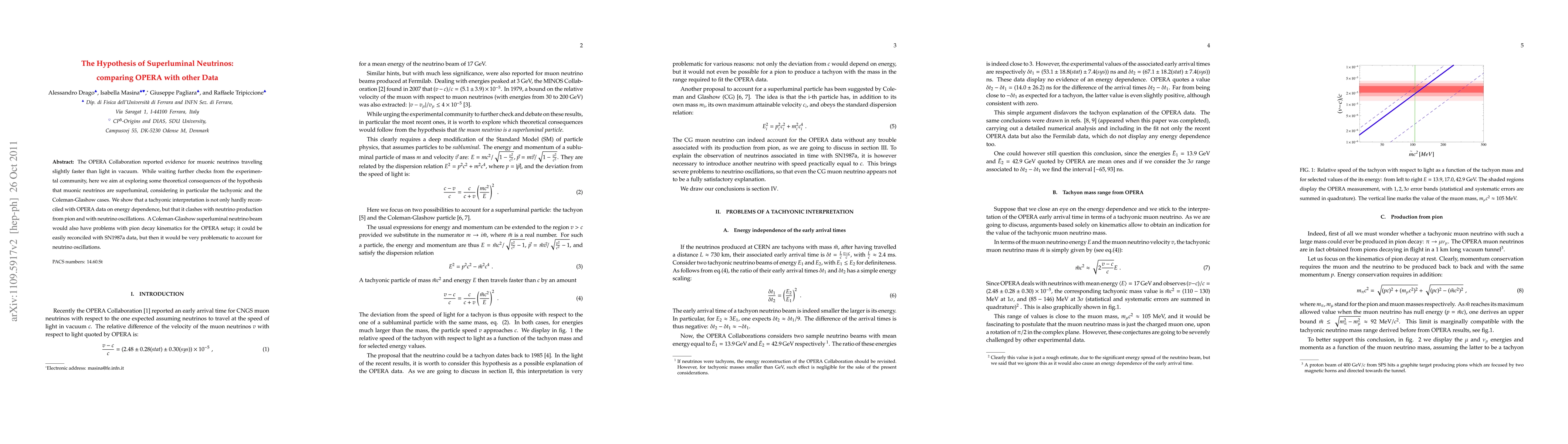 The OPERA Collaboration reported neutrinos traveling faster than light, prompting an exploration of theoretical implications. The tachyonic interpretation conflicts with energy dependence data and neutrino production, while a Coleman-Glashow superluminal neutrino beam faces issues with pion decay and neutrino oscillations.