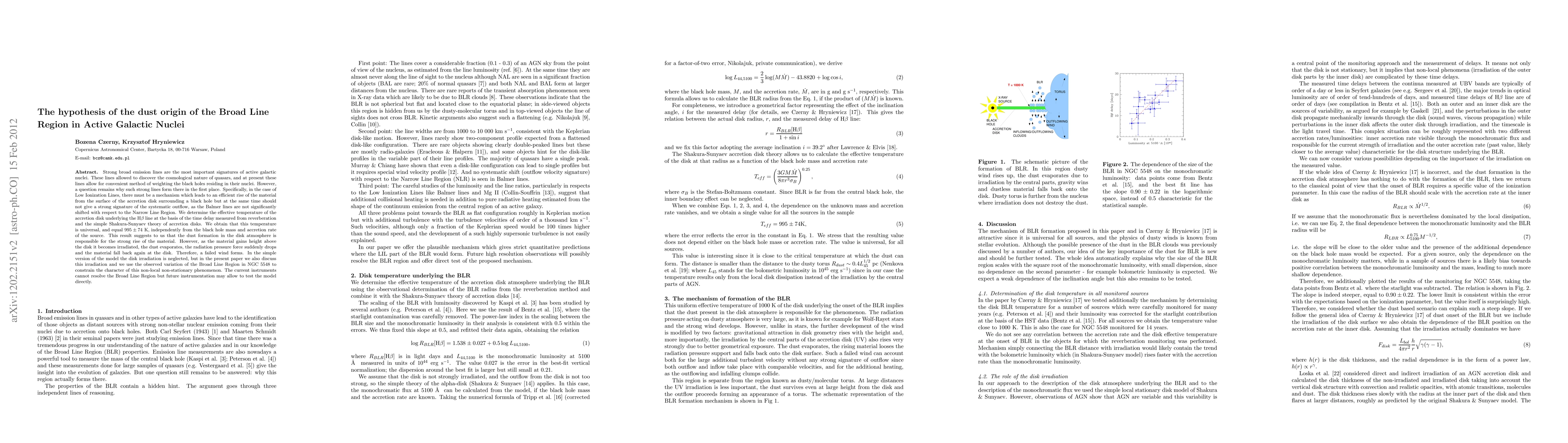 The paper presents a detailed analysis using reverberation mapping and the Shakura-Sunyaev theory to determine the effective temperature of the accretion disk underlying the BLR, proposing a dust-driven failed wind mechanism for BLR formation.