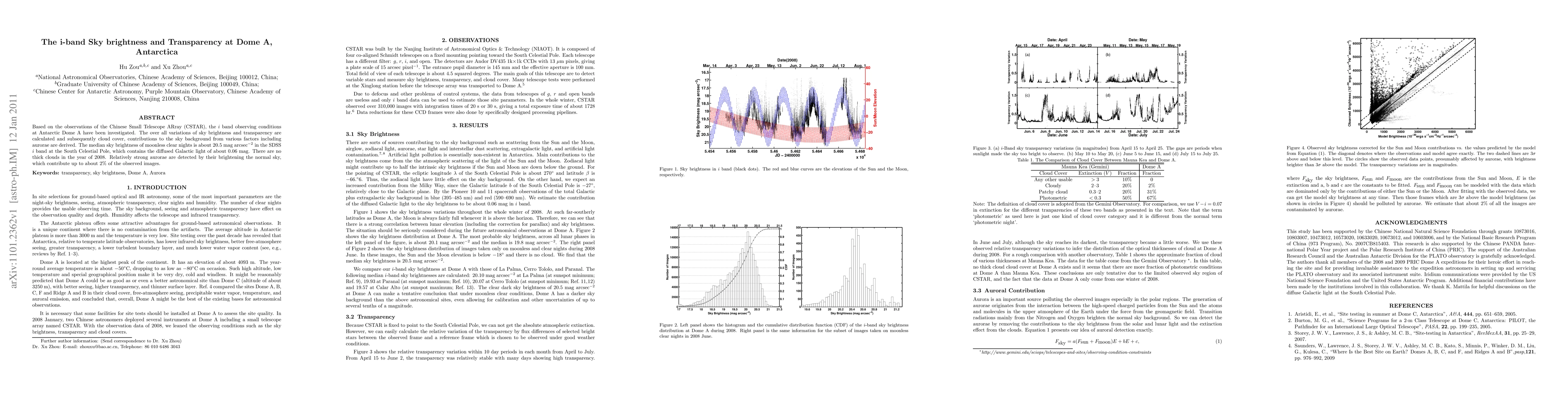This study investigates the i-band sky brightness and transparency at Dome A, Antarctica, using CSTAR observations. The median sky brightness for moonless clear nights is about 20.5 mag arcsec$^{-2}$, with minimal cloud cover and contributions from aurorae accounting for up to 2% of observed images.