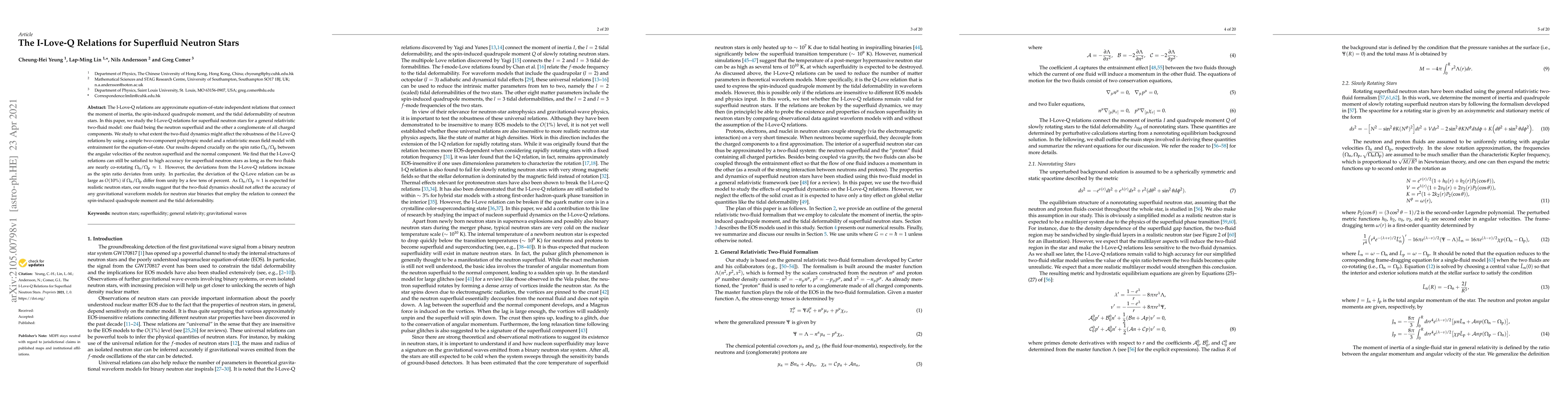 This paper investigates the I-Love-Q relations for superfluid neutron stars using a general relativistic two-fluid model. It finds that the relations hold accurately when the neutron superfluid and normal fluid co-rotate, but deviations can occur if their spin ratios differ significantly, potentially impacting gravitational waveform models.