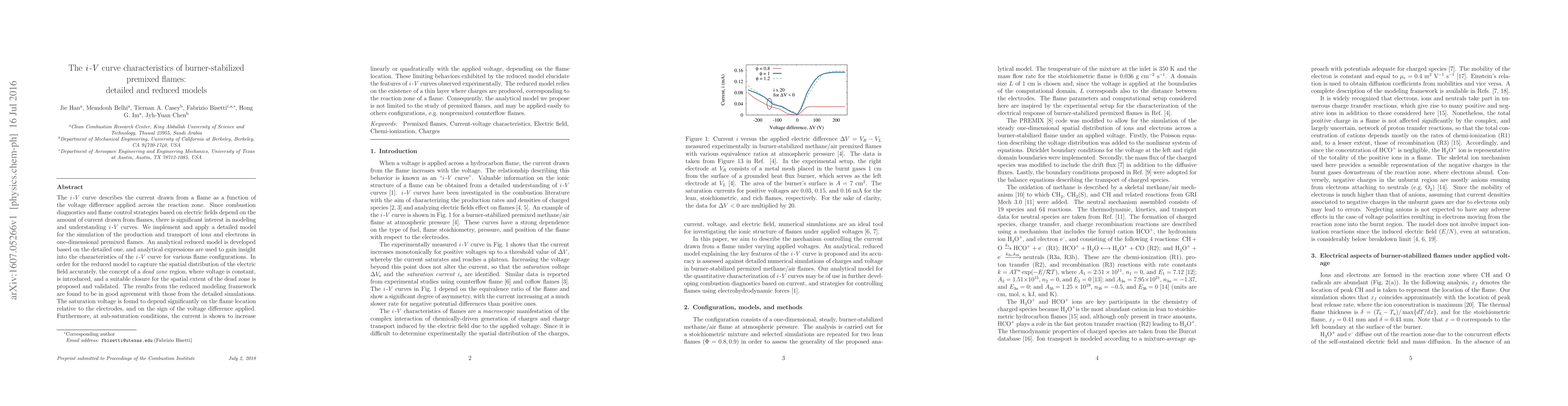 This paper models the i-V curve of burner-stabilized premixed flames using detailed and reduced models, introducing a dead zone concept to accurately capture the electric field distribution. The reduced model reveals that the saturation voltage depends on flame-electrode positioning and voltage sign, and elucidates the linear or quadratic current-voltage relationships observed experimentally.