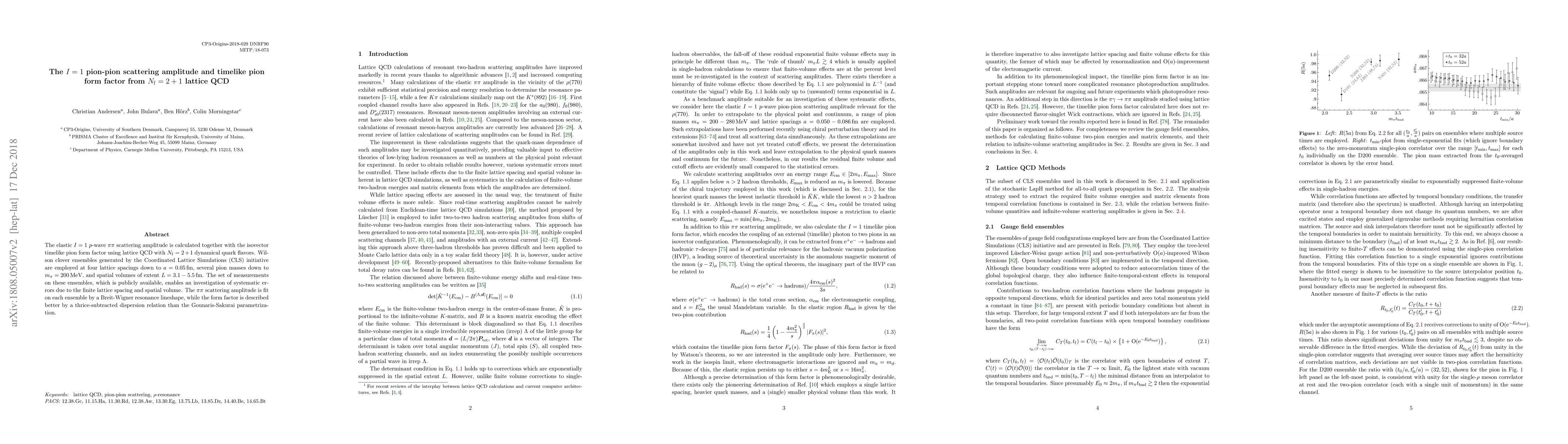 This paper calculates the $I=1$ pion-pion scattering amplitude and the isovector timelike pion form factor using lattice QCD with $N_{\rm f}=2+1$ flavors, employing ensembles from the CLS initiative to study systematic errors. The scattering amplitude is fitted using a Breit-Wigner lineshape, while the form factor is better described by a thrice-subtracted dispersion relation.