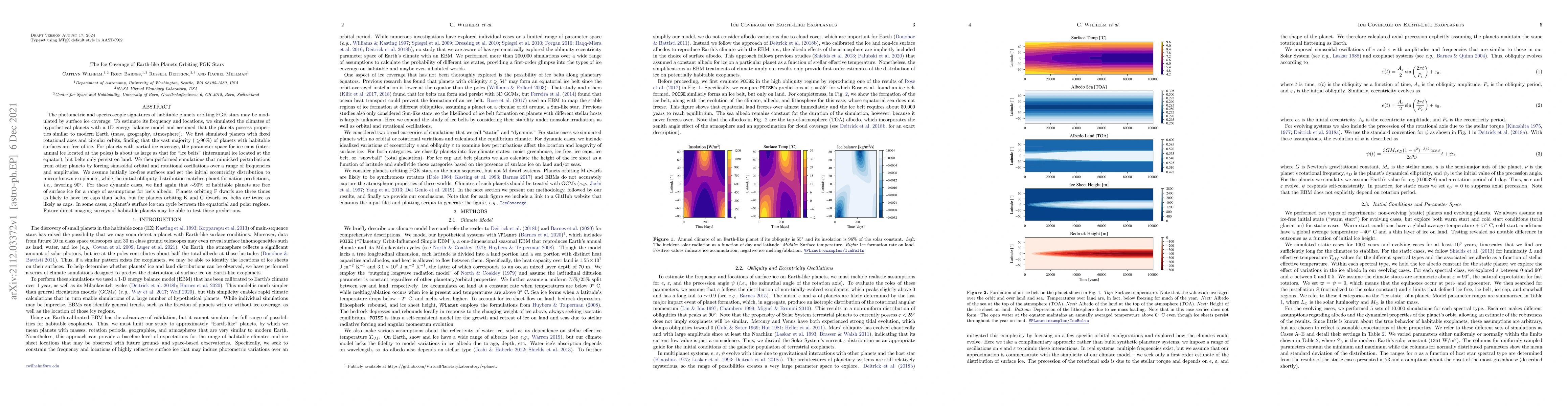 This study uses a 1D energy balance model to simulate the climates of Earth-like planets orbiting FGK stars, finding that over 90% of habitable planets are ice-free. For those with ice, ice belts are more common than caps, especially for K and G stars, with F dwarfs showing the opposite trend.