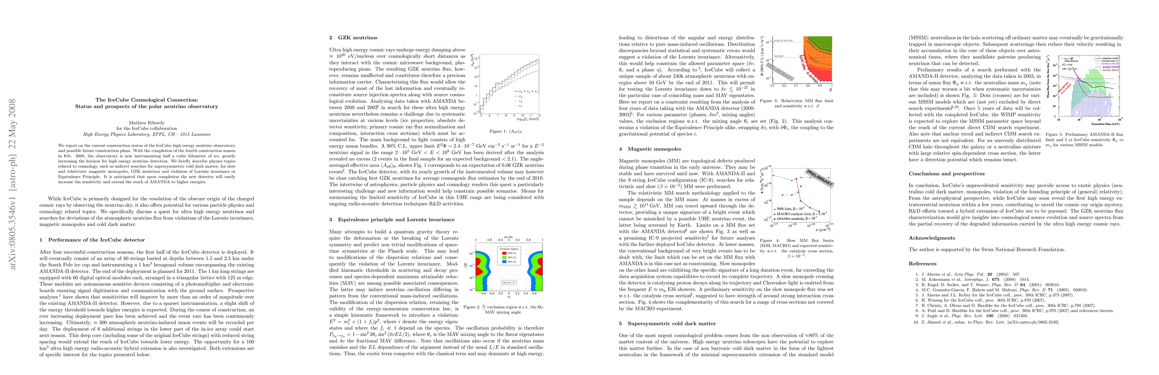 The IceCube observatory, now half complete, is set to significantly enhance high energy neutrino detection, with plans for future completion. It aims to explore cosmology, including searches for dark matter, magnetic monopoles, and tests of fundamental physics laws.